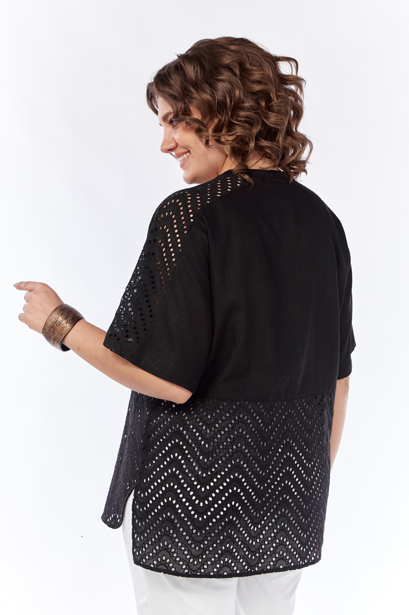 Длина блузки по спинке — 71 см, длина плеча + рукав — 41 см.