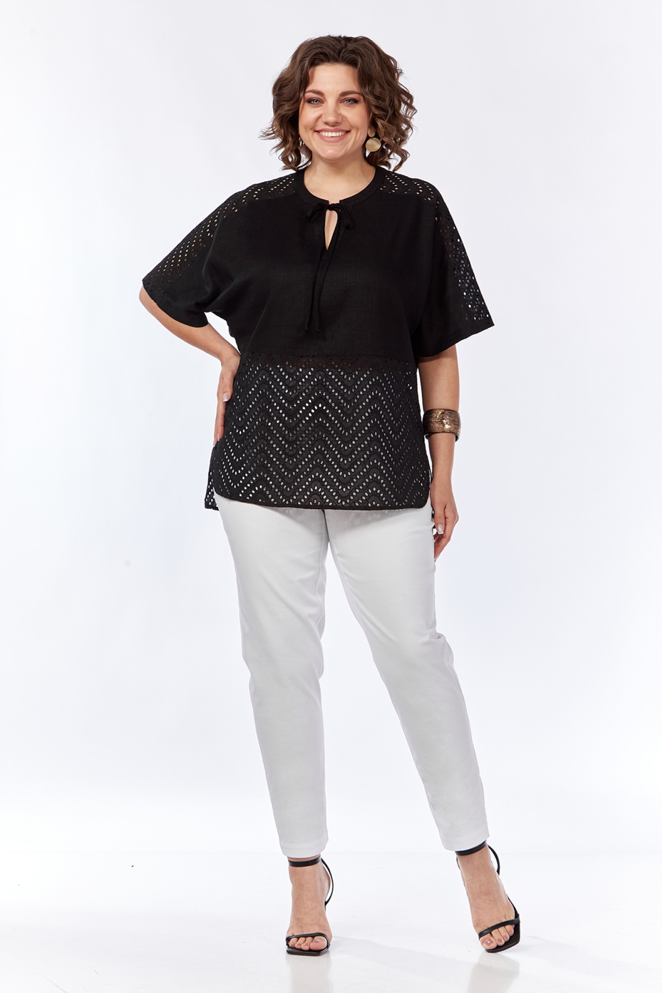 Блузка женская, свободного силуэта, выполнена путем комбинации тканей двух видов льна и хлопок шитью. Перед и спинка отрезные по линии талии. Горловина обработана фигурными планками с завязами. По боковым имеются разрезы. Рукав спущенный. Обращаем Ваше внимание, что цвет на экране может отличаться от реального.