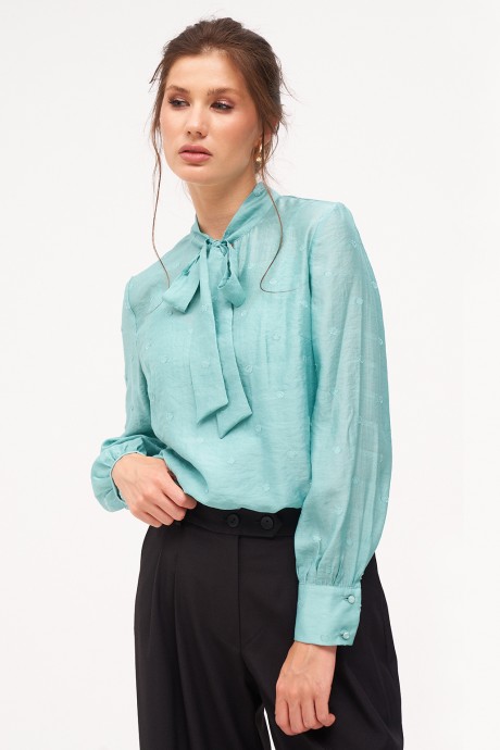 Классическая блузка прямого силуэта. Рукава на манжетах с застёжкой на пуговицы. По горловине стойка, переходящая в завязку для банта. В комплекте топ из хлопка.