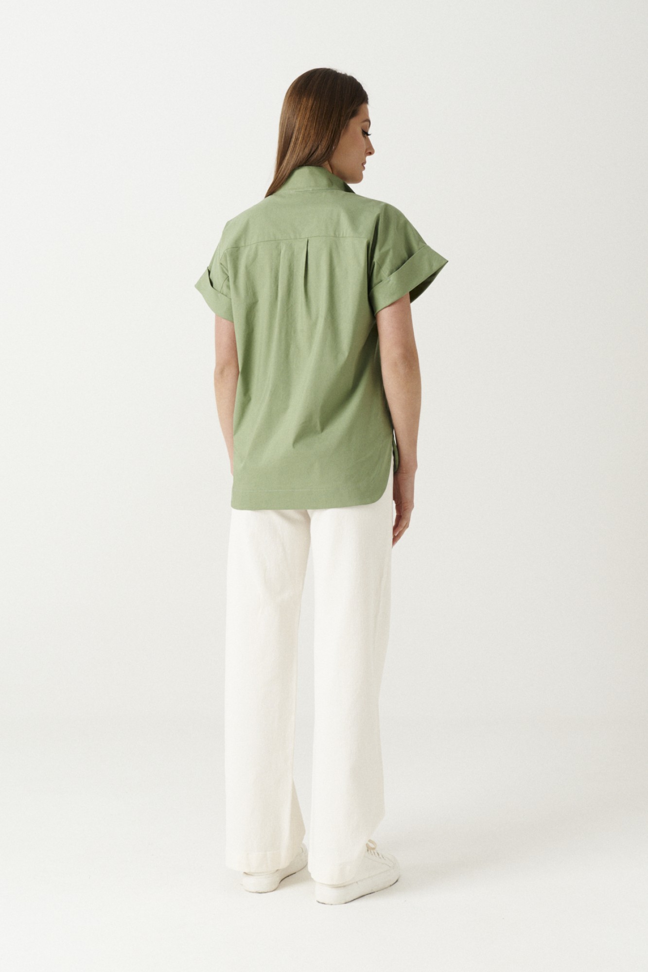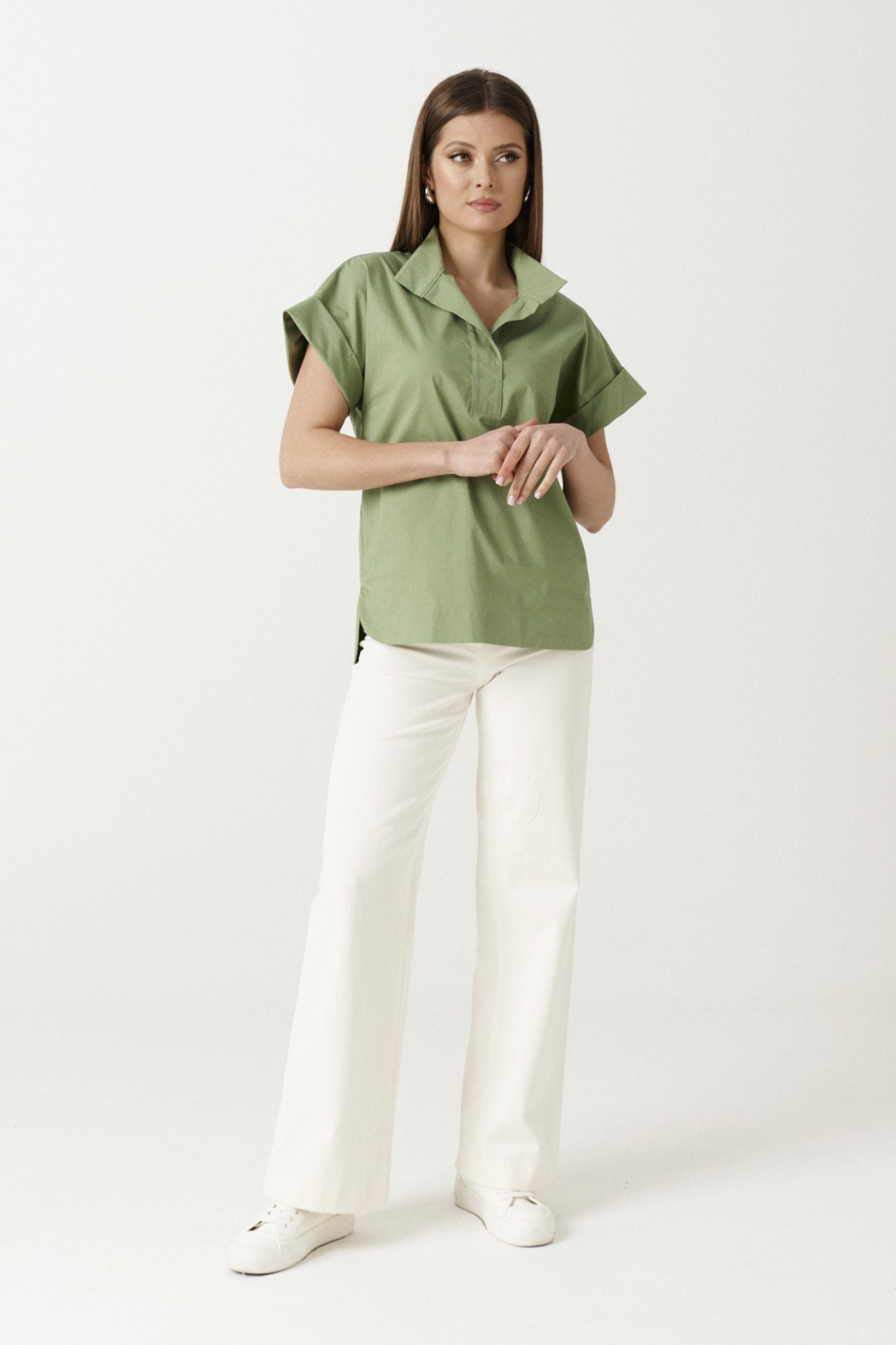 Блуза женская из хлопковой ткани для повседневной носки. Блуза прямого силуэта с коротким цельнокроеным рукавом оформленным отложной манжетой. По горловине имеется притачная стойка. Горловина оформлена декоративной планкой с декоративными закрепками. По спинке отрезная кокетка, от кокетки идут складки.