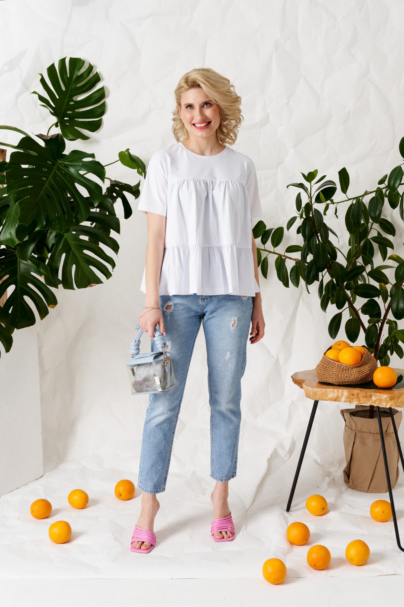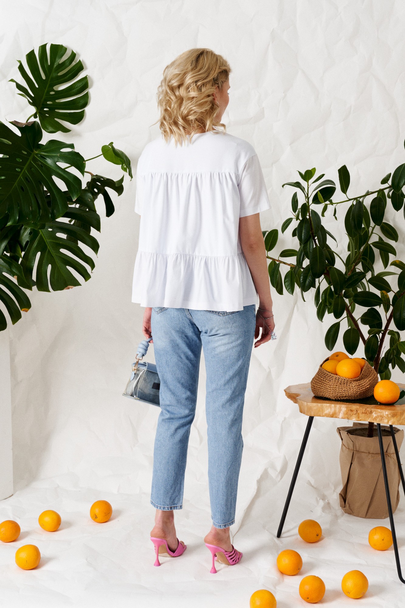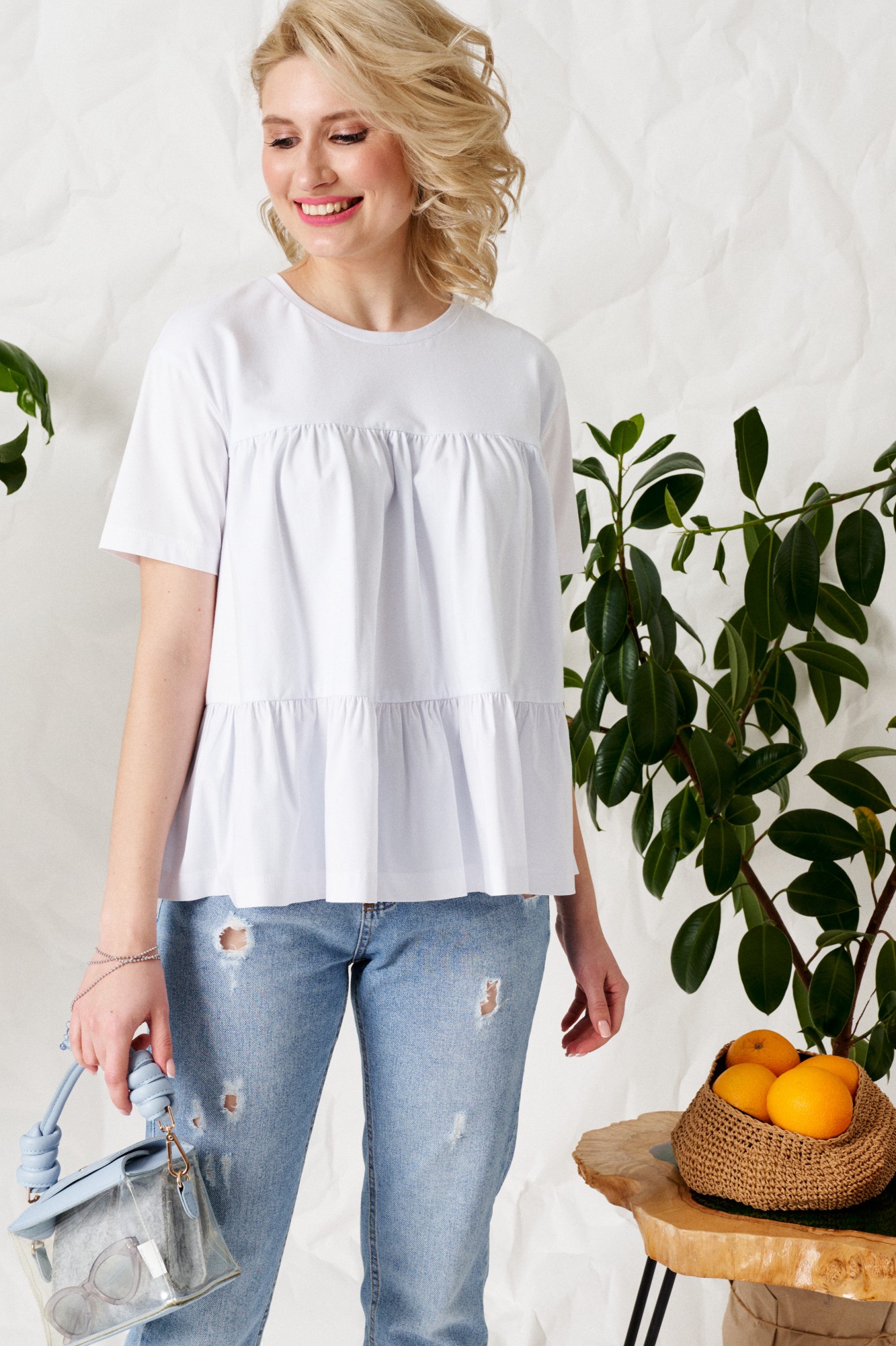 По переду и спинке расположены воланы со сборкой. Рукав прямой, короткий. Блузка выполнена из комбинации рубашечной ткани и трикотажа, что делает ее невероятно удобной в носке. Преимущества кроя этой блузки в том, что такой силуэт скроет все недостатки вашей фигуры, но при этом вы останетесь женственной и летящей.