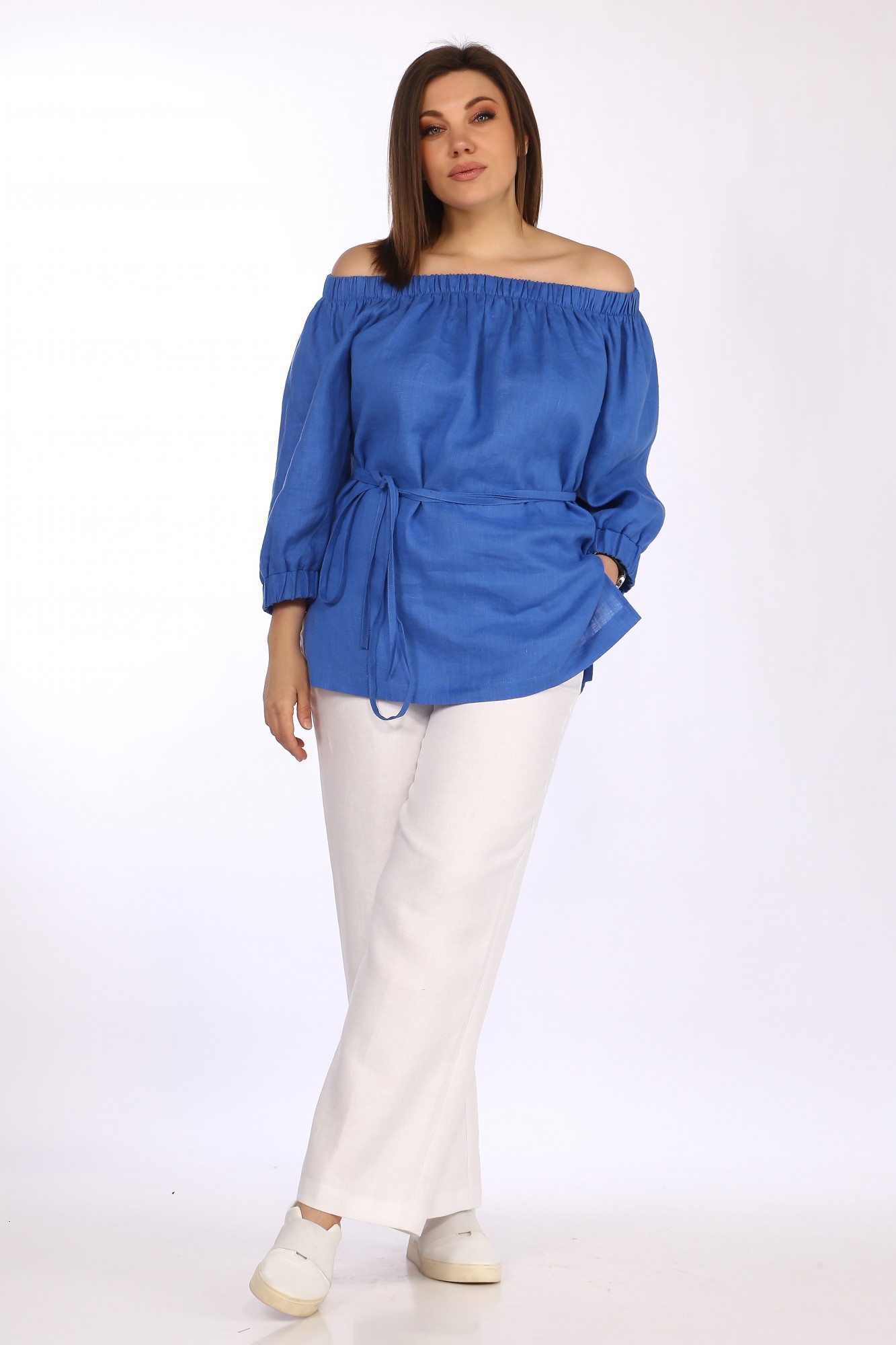Вырез горловины глубокая лодочка на эластичной сборке, что позволяет менять форму выреза от декольте, до асимметрии. Пояс в комплекте."