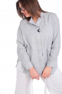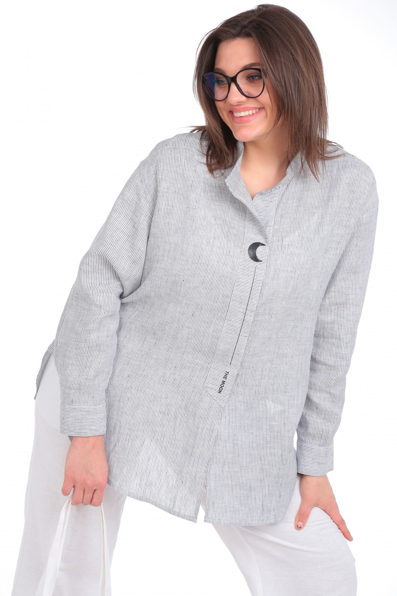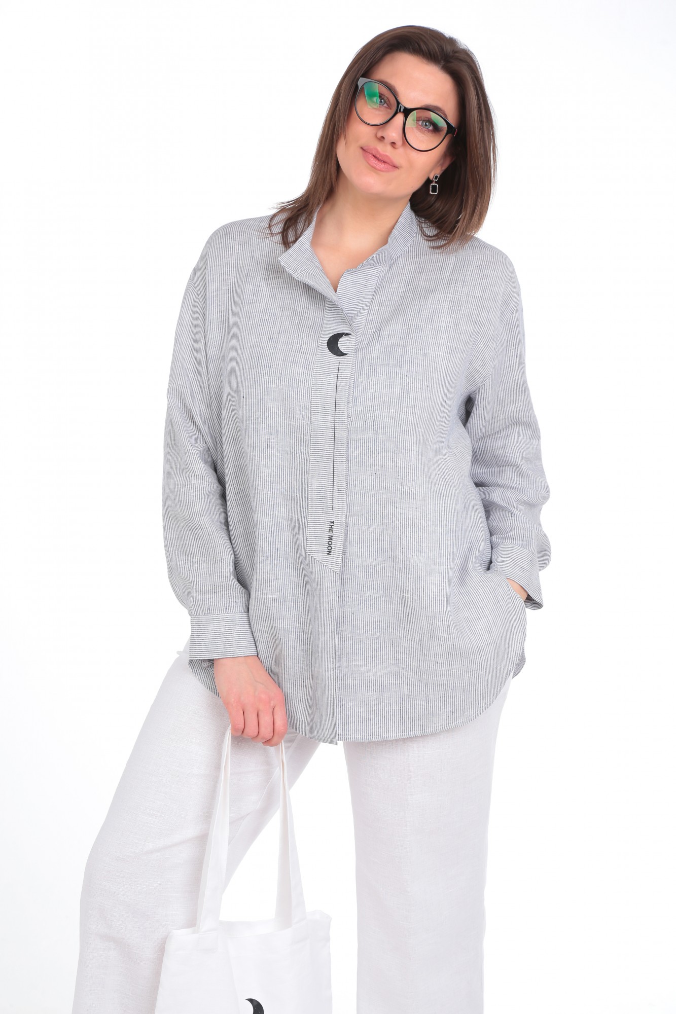 Брузка рубашечного типа из натурального умягченного льна, свободного силуэта, рукав втачной с манжетой, воротник стойка. Потайная застёжка на кнопки. Низ фигурный. Спинка на заниженной кокетке. И декоративной застрочной складкой.