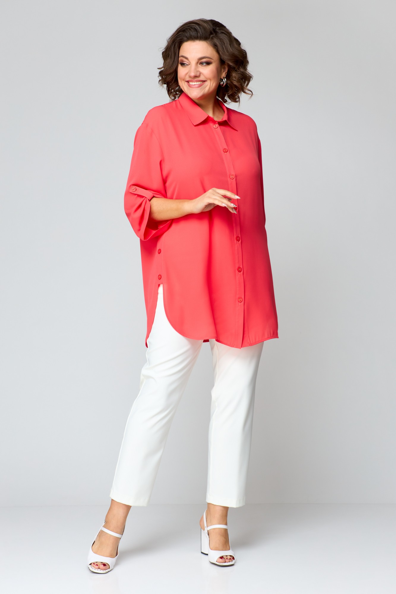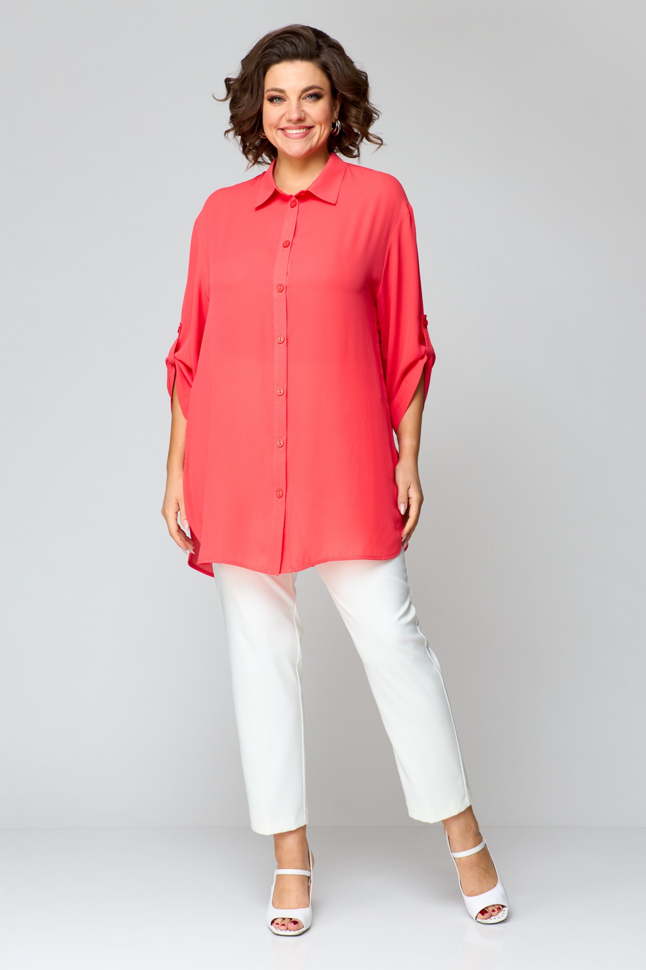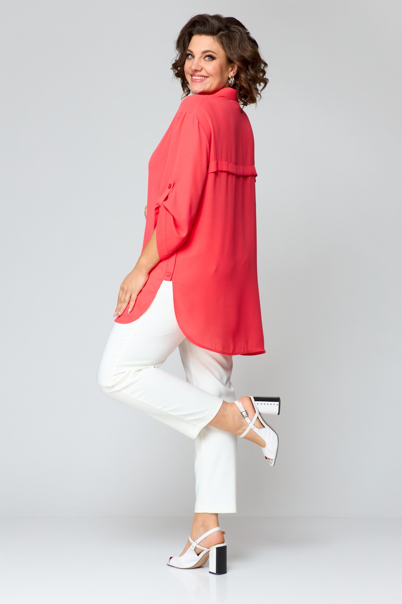 Блузка прямого силуэта, длиной ниже бедер, выполнена из однотонной ткани. Полочка с застежкой на петли и пуговицы, по правой нижней части декор в виде принта. Спинка с отрезной кокеткой, но которой выполнен декор в виде принта. Воротник рубашечного типа, стояче-отложной. Низ блузки ассиметричный, по боковым швам обработана застежка. Пройма углубленной формы, рукав рубашечного типа, длиной 7/8 по низу с патами.