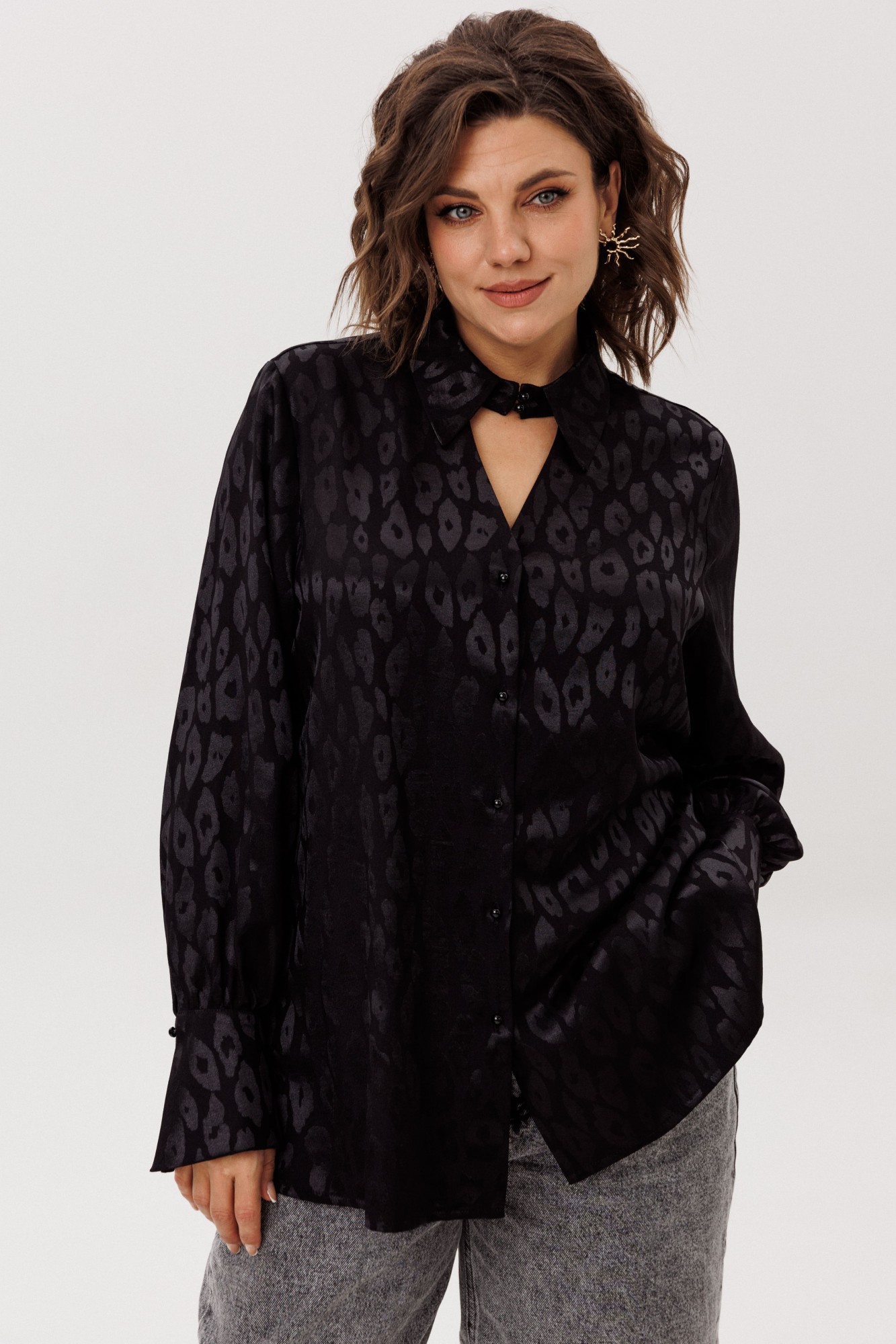 Погрузитесь в ощущение утонченной легкости с этой рубашкой, где каждая деталь — это штрих к портрету вашего безупречного вкуса. Мягкая, струящаяся вискоза с выразительным принтом обволакивает фигуру свободным, прямым силуэтом, даря невесомый комфорт и свободу движений. V-образный вырез, обрамленный элегантным воротником на стойке, становится главным аккордом всего образа — он подчеркивает линию шеи, придавая ей изысканную графичность и собранность. Этот элемент — та самая изюминка, что превращает повседневную вещь в предмет особого шика, говорящий о вашем внимании к деталям. Длинные рукава, завершающиеся изящными манжетами, и скрытые боковые разрезы подчеркивают динамику и пластику силуэта, добавляя ему воздушности. Классическая застежка на пуговицы сквозь аккуратные петли довершает образ, наполненный гармонией и стилем. Эта рубашка от Анелли — не просто часть гардероба, это возможность чувствовать себя неотразимой каждый день, подчеркивая свою индивидуальность с помощью безупречного кроя и значимых акцентов.