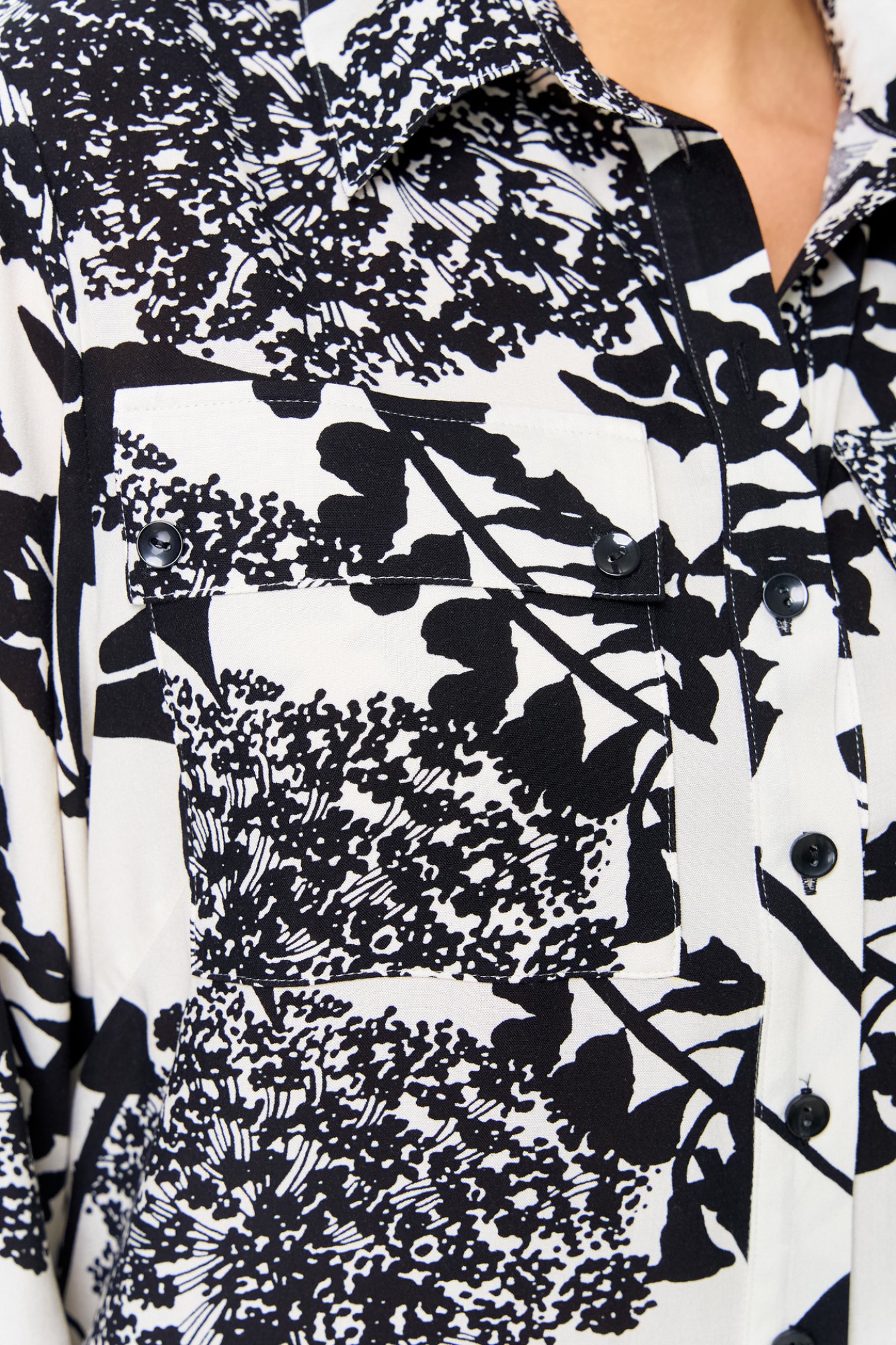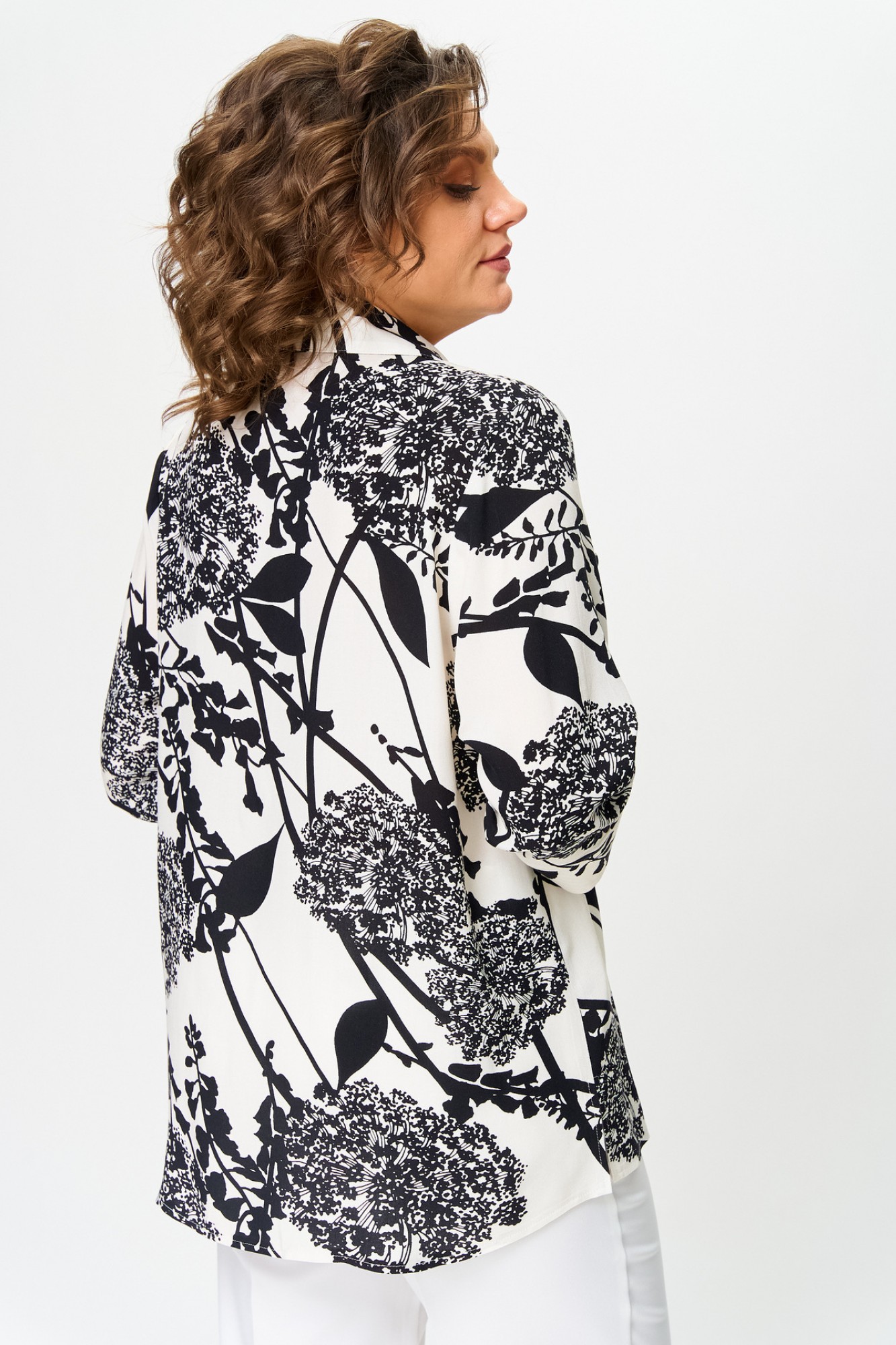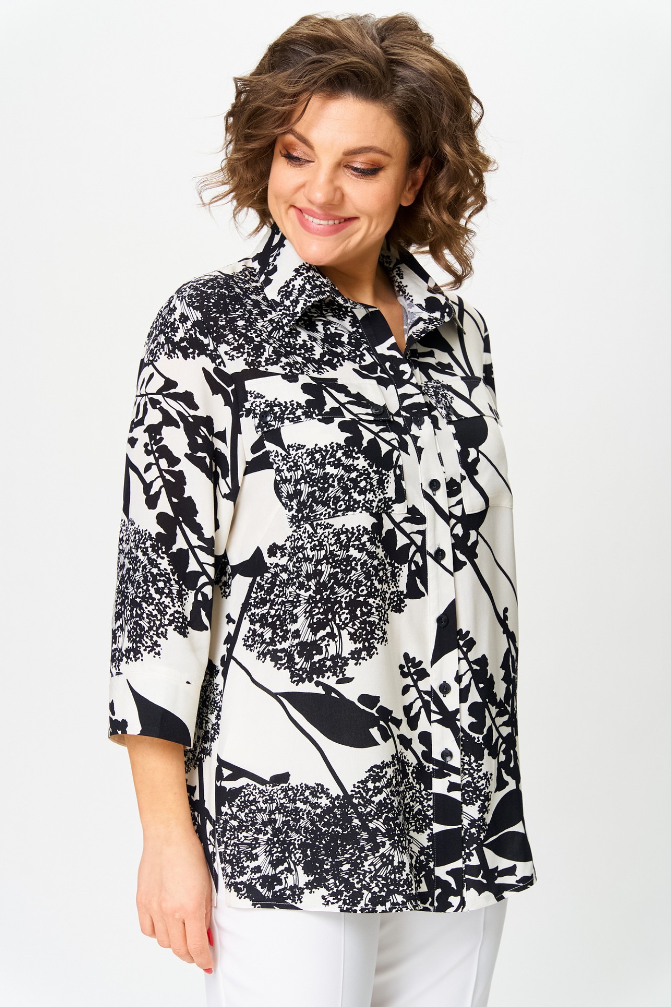 Блуза женская, прямого силуэта из текстильной ткани. Воротник отложной, застежка центральная на петли-пуговицы. По переду нагрудные вытачки и настрочены накладные карманы. Спинка цельная. Рукав втачной, одношовный, 3/4, с притачной манжетой. В боковых швах по низу небольшие разрезы.
