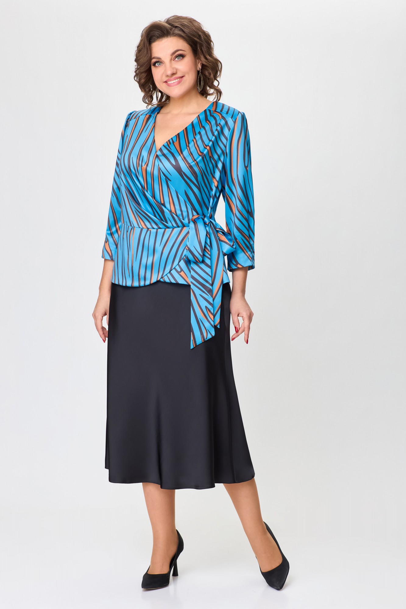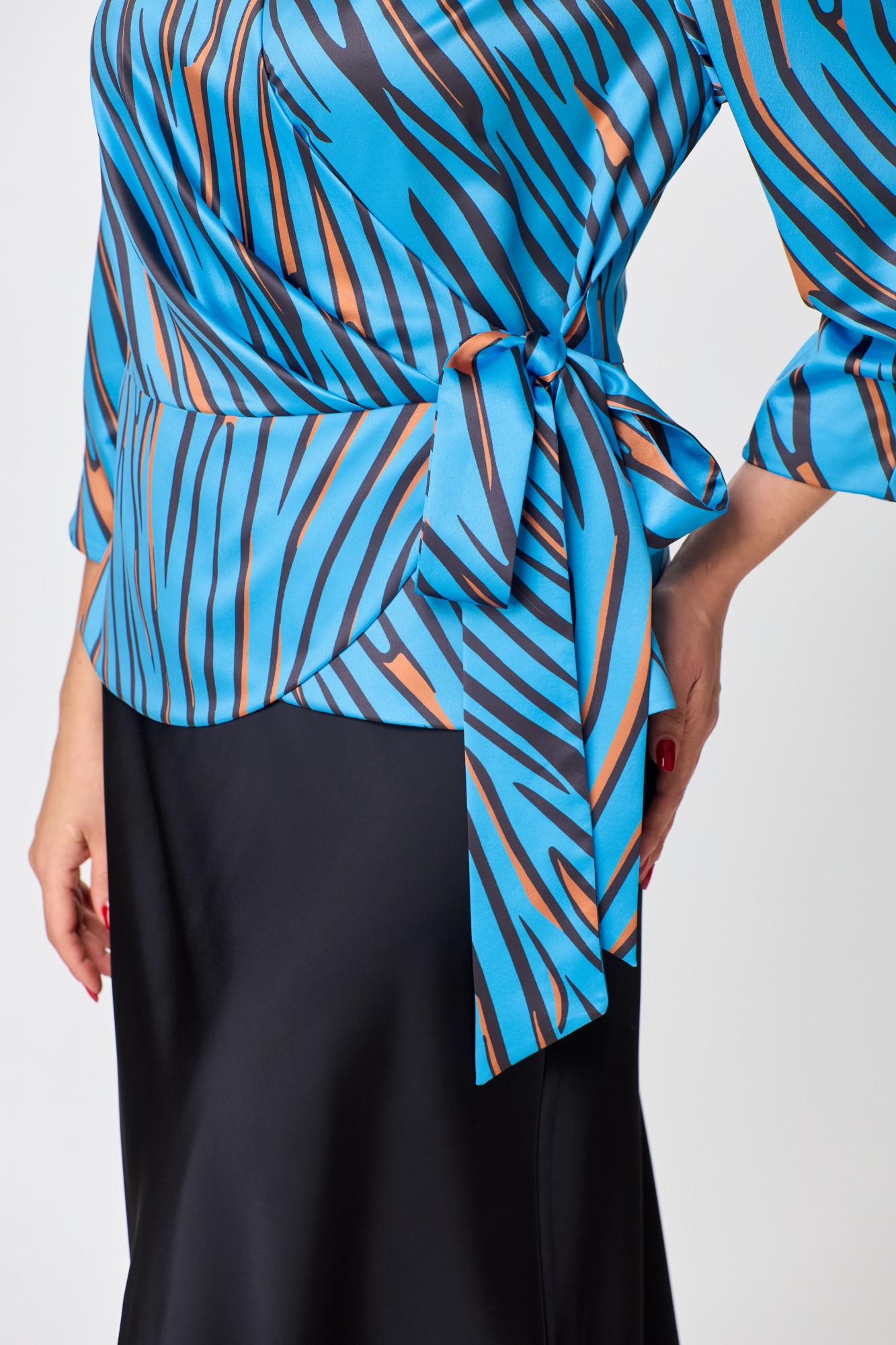 Блузка женская полуприлегающего силуэта, с баской от линии талии. По переду кокетки в области плеча, ассиметричные складки от кокетки и от талии. Застежка на запах: пояс сверху и петли и пуговицы внутри.. рукав в точной, длиной ¾ со сборкой по окату и двумя складками по низу. По спинке баска и таллиевые вытачки.
