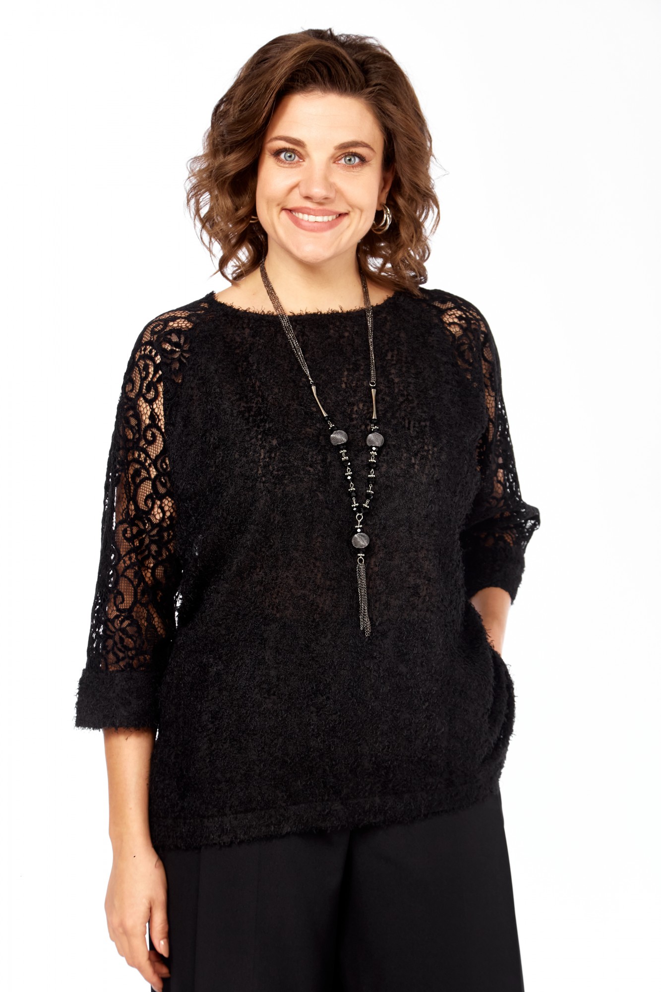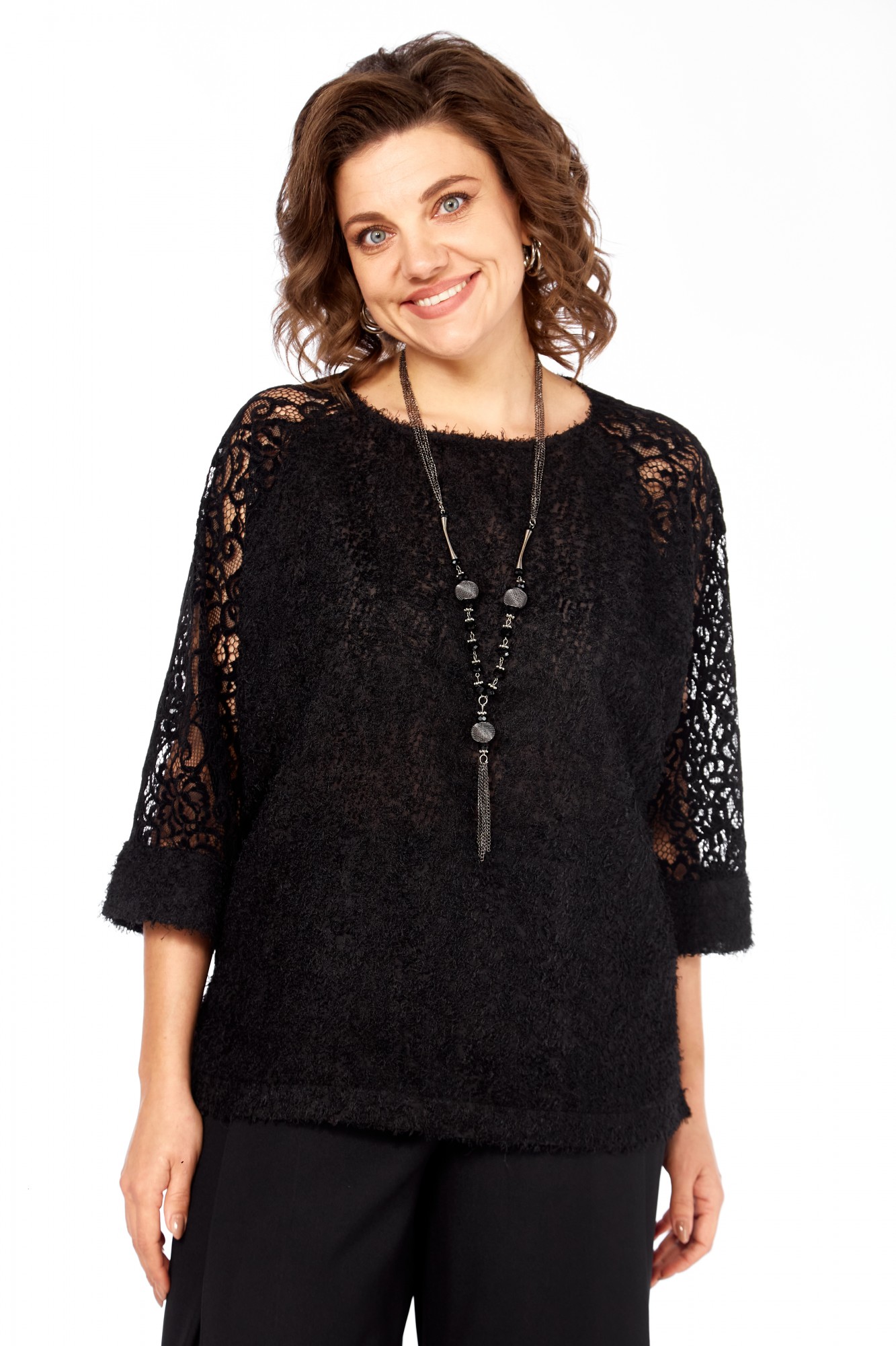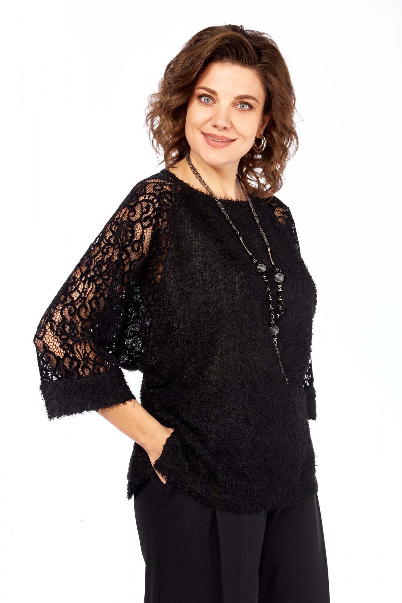 Праздничная элегантная блузка полуприлегающего силуэта, выглядит эффектно, прекрасно подойдет для вечерних мероприятий. Горловина аккуратной округлой формы. Рукав выполнен из мягкого кружева, что придает дополнительный шарм, длина 7/8. В боковых швах предусмотрены разрезы.