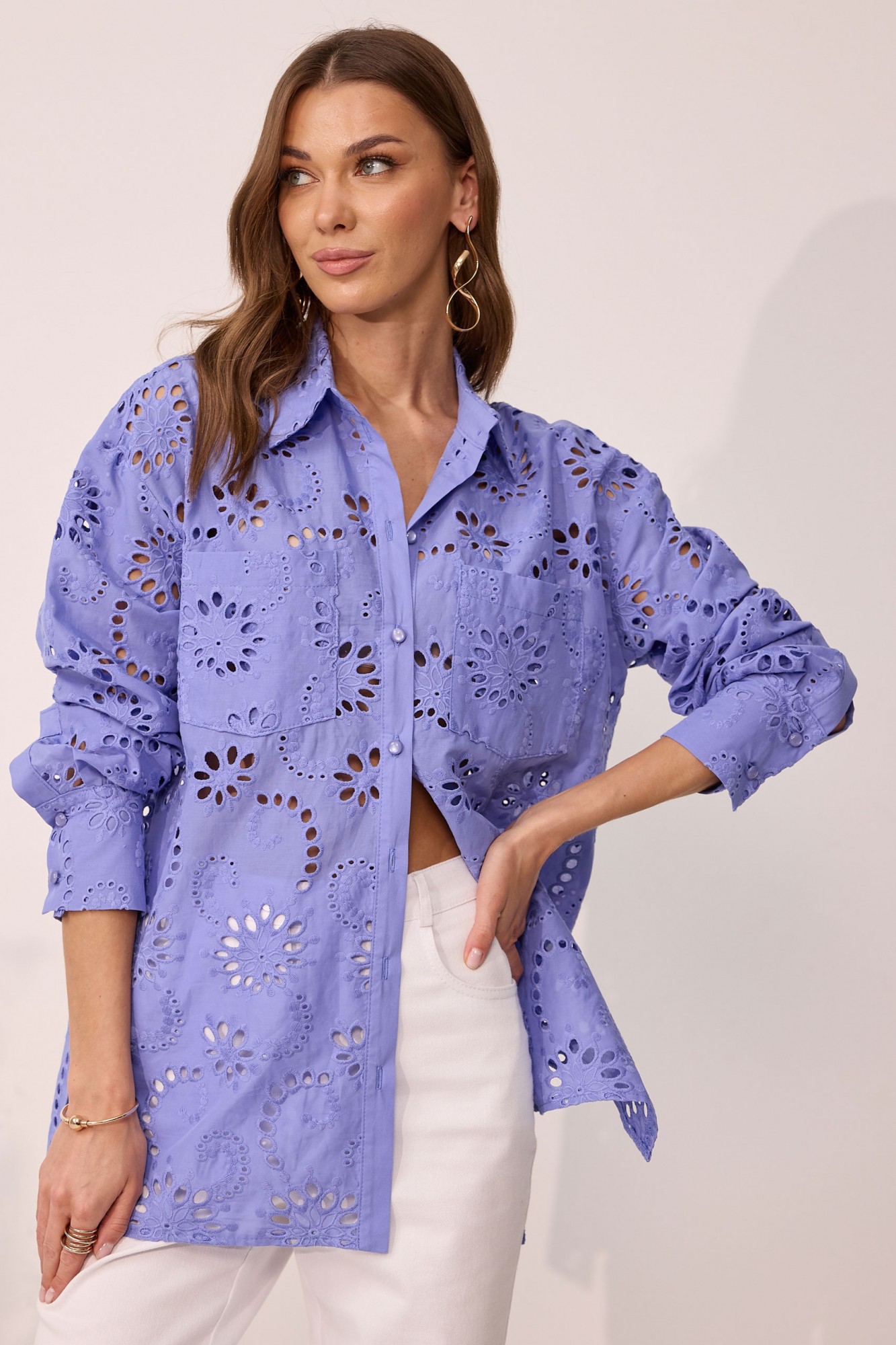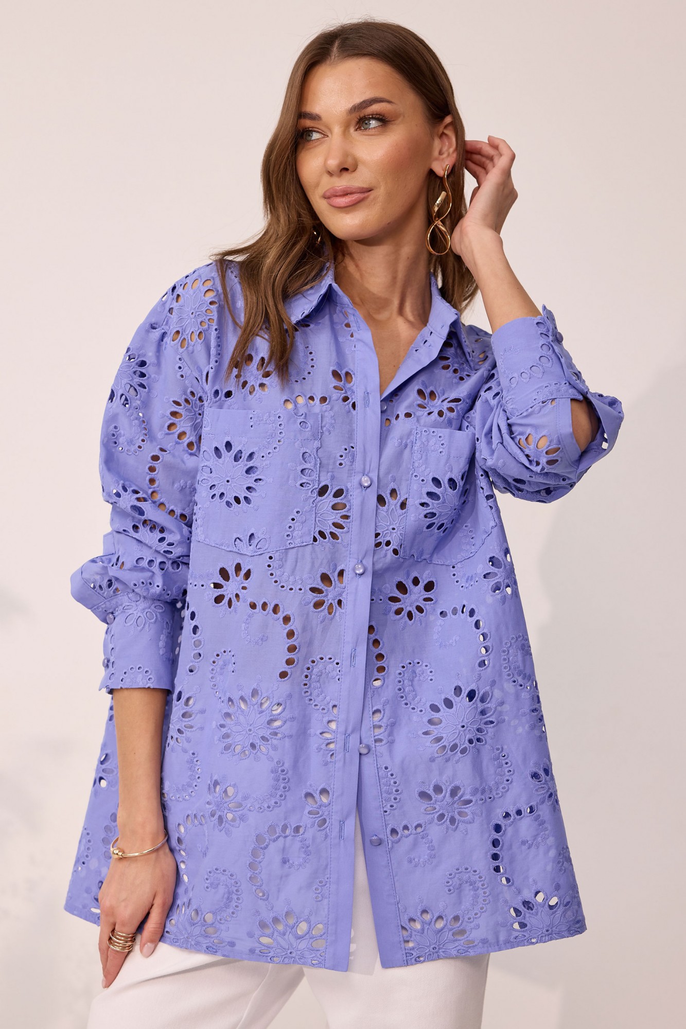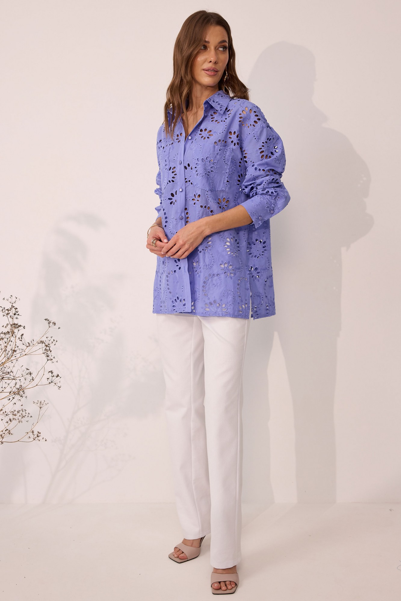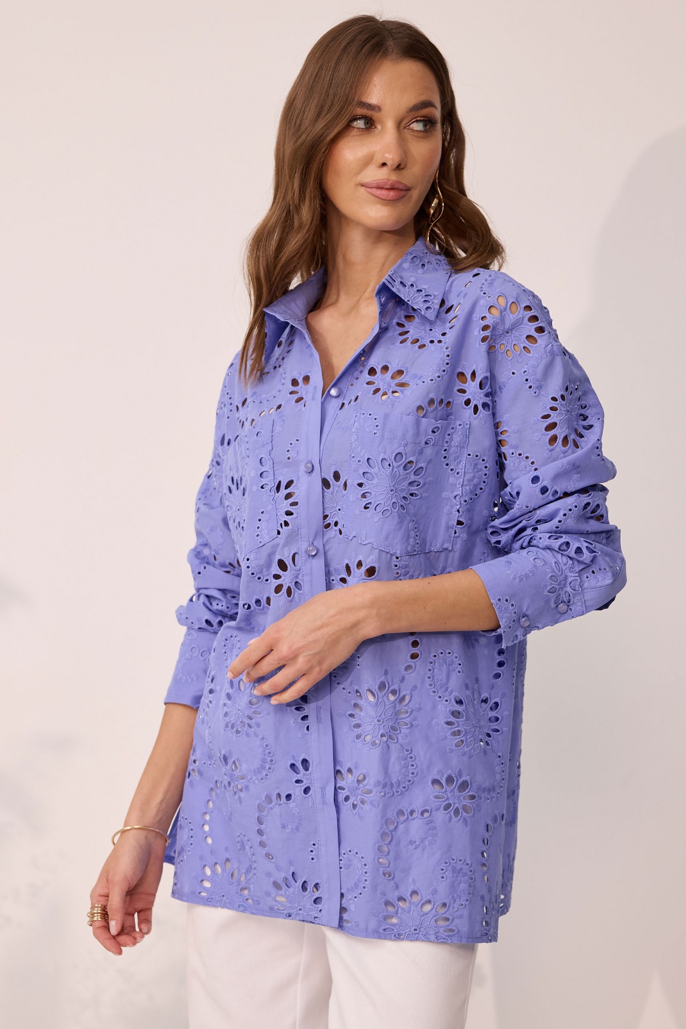 Элегантная белая блузка из роскошного ришелье создаст безупречный образ для вашего гардероба. Блузка с классическим рубашечным воротником и центральной застежкой на петли и пуговицы обладает чистыми линиями и изысканным силуэтом. Длинные втачные рукава завершаются манжетами также на пуговицы, добавляя формальный штрих. Нагрудные карманы на передней части придают функциональность, в то время как оригинальные складки и кокетка на спинке дополняют дизайн, обеспечивая прекрасную посадку. Блузка дополнена деликатными разрезами по боковым швам, подчеркивающими её утончённый стиль. Идеальный выбор для создания как деловых, так и повседневных образов.