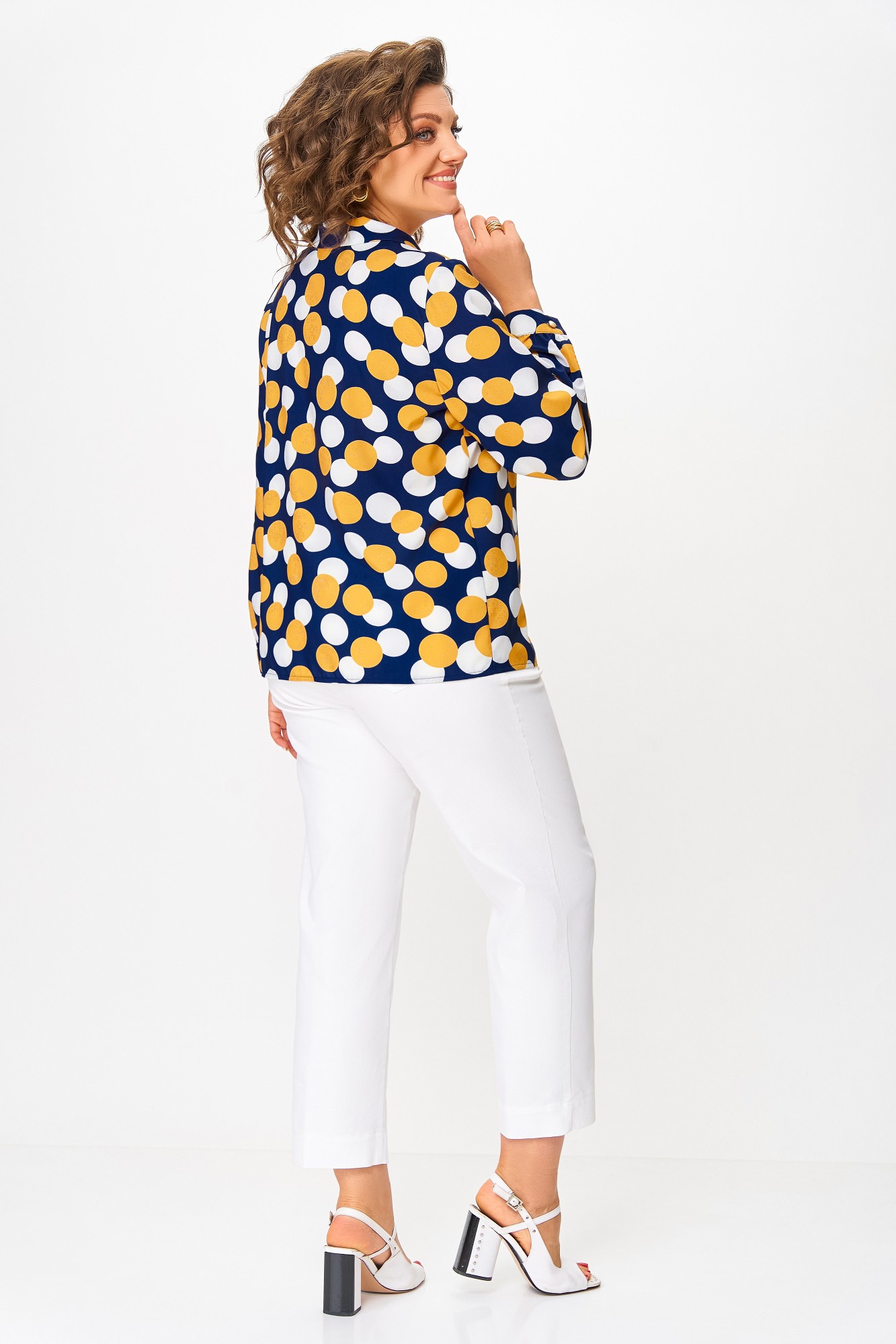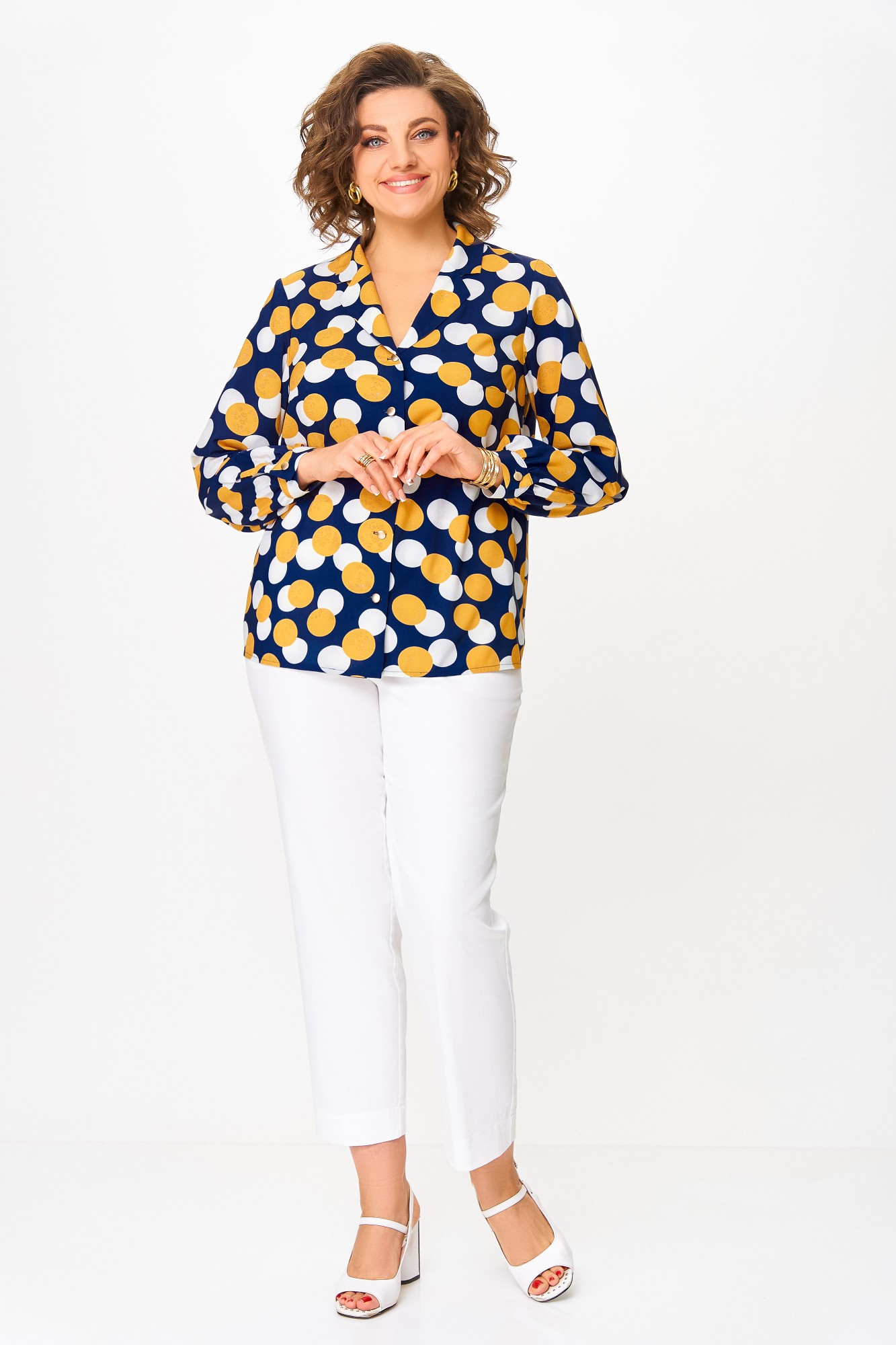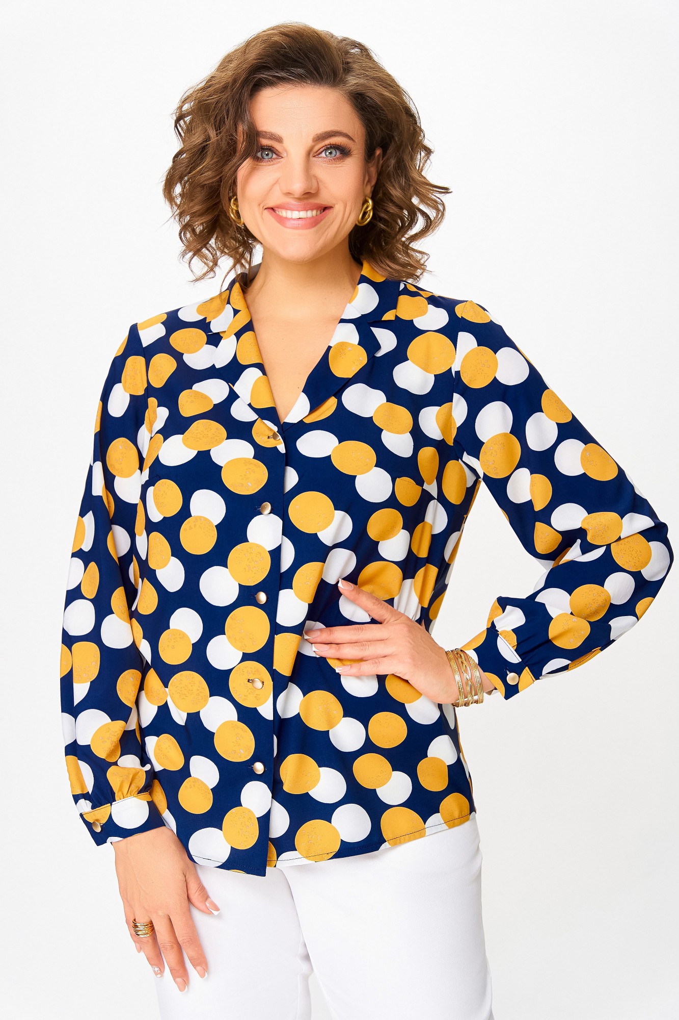 Блузка Swallow 842 .3 Синий, принт горчичные и молочные круги