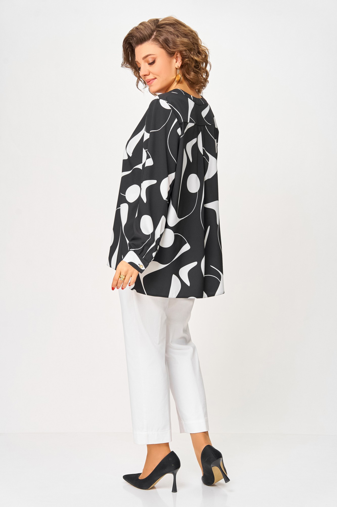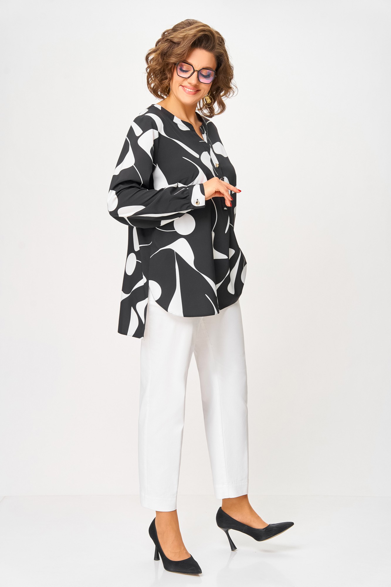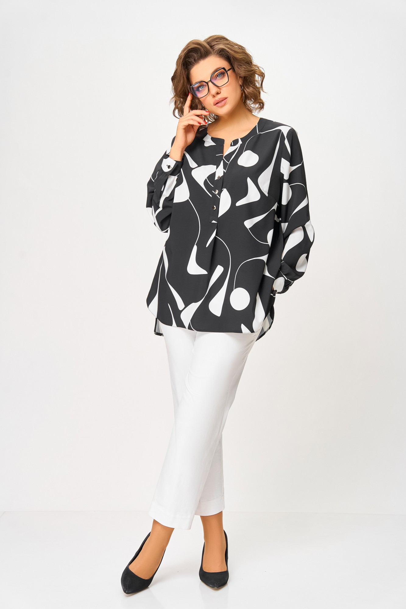 Блузка женская свободного силуэта, выполнена из вискозной ткани. По полочке нагрудные вытачки и фигурная планка до талии с застёжкой на 3 петли и 3 декоративные пуговицы, в низу под планкой, на полочке заложена односторонняя складка. Спинка с отрезной кокеткой и бантовой складкой. Горловина округлой формы с притачной стойкой и V-образным вырезом по планке. Рукав втачной, одношовный внизу со сборкой и манжетой, которая застёгивается на петлю и пуговицу. Низ полочки закруглённой формы, низ спинки прямой и длинее