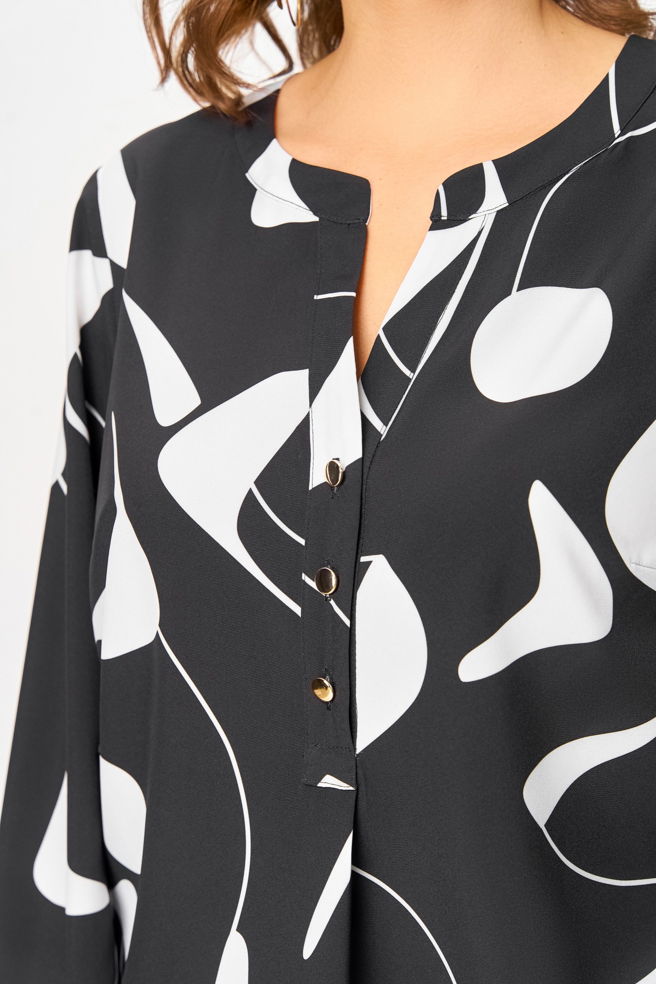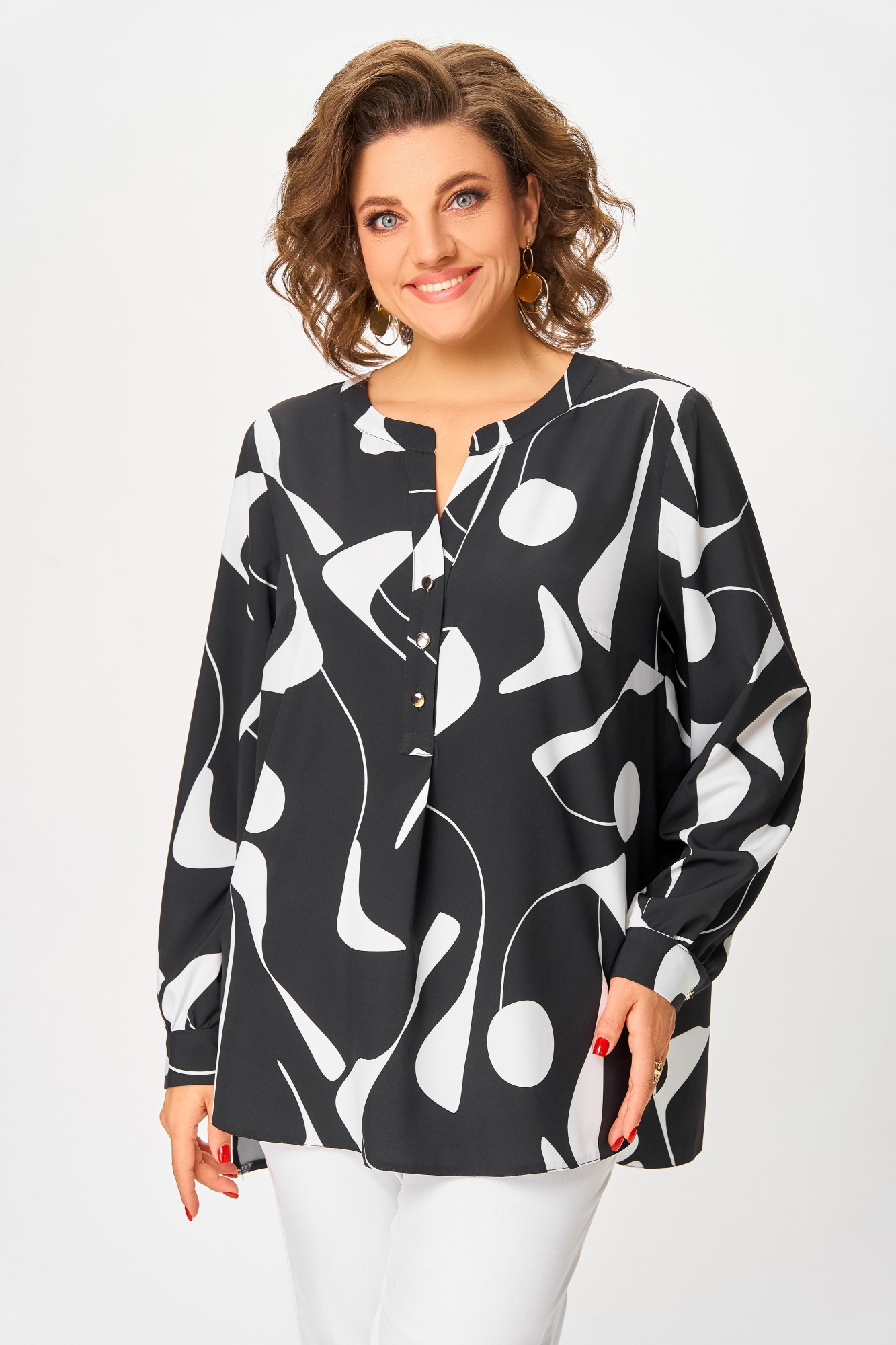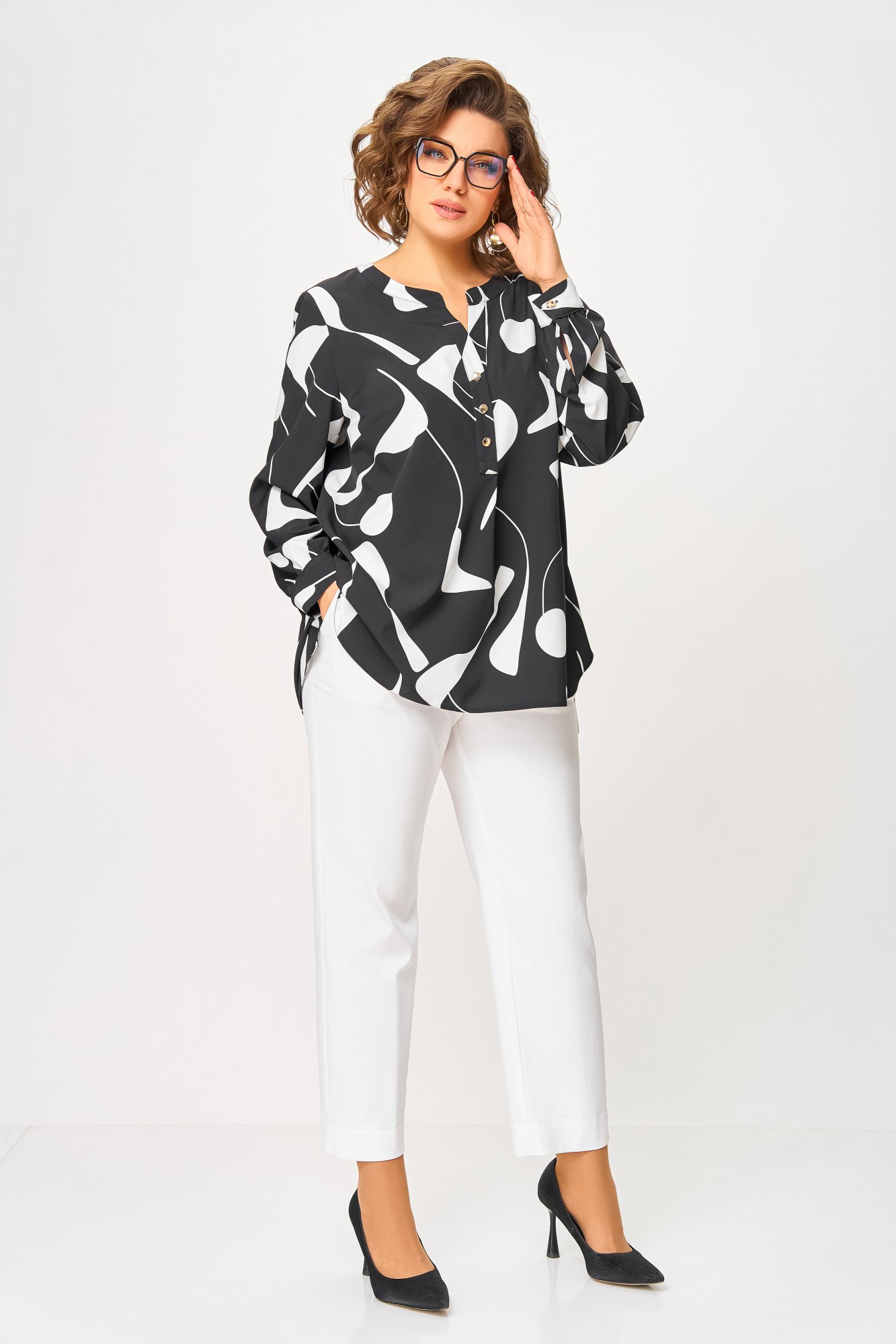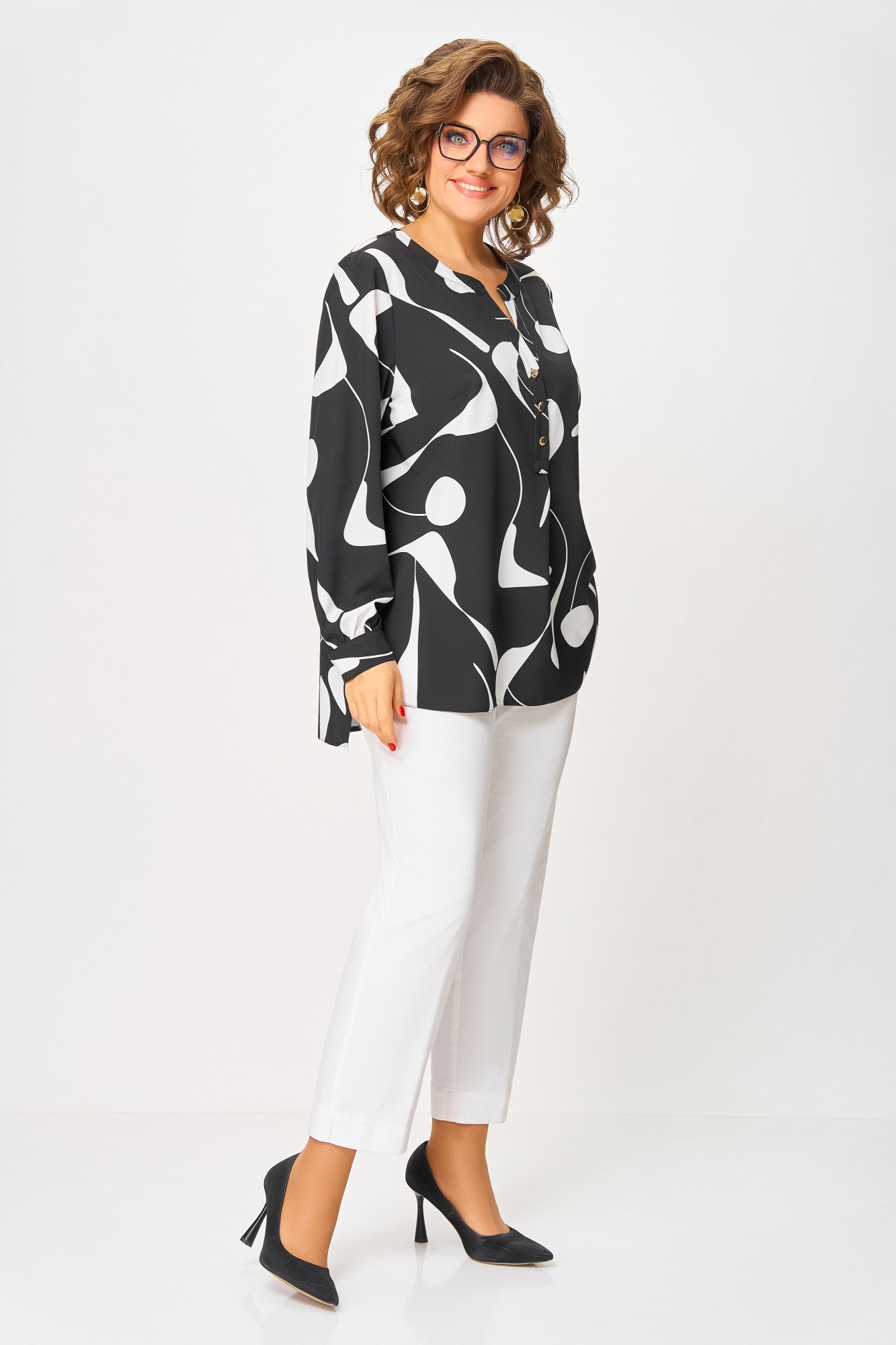 Блузка женская свободного силуэта, выполнена из вискозной ткани. По полочке нагрудные вытачки и фигурная планка до талии с застёжкой на 3 петли и 3 декоративные пуговицы, в низу под планкой, на полочке заложена односторонняя складка. Спинка с отрезной кокеткой и бантовой складкой. Горловина округлой формы с притачной стойкой и V-образным вырезом по планке. Рукав втачной, одношовный внизу со сборкой и манжетой, которая застёгивается на петлю и пуговицу. Низ полочки закруглённой формы, низ спинки прямой и длинее