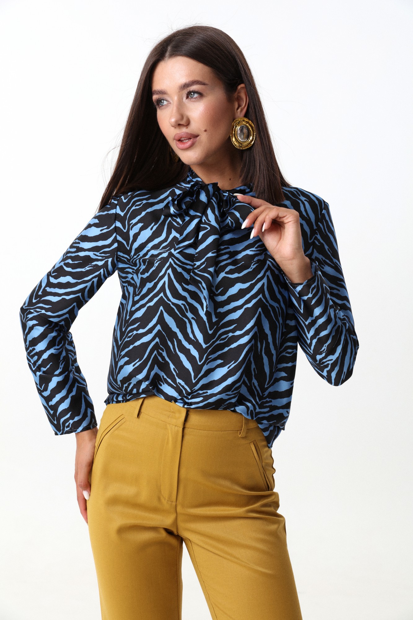 Элегантная блуза из плотной струящейся ткани с атласным эффектом объёмного кроя, с декоративными завязками на горловине. По переду блузы прошиты нагрудные вытачки. Манжеты с застёжкой на пуговицу.