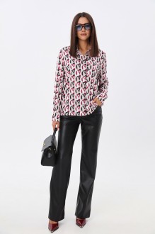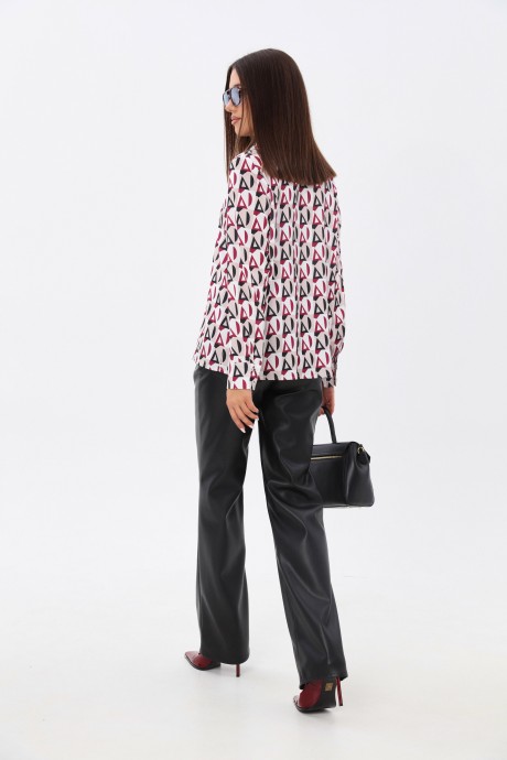 Блузка прямого силуэта с оригинальным принтом из лёгкой ткани с атласным мягким блеском. Воротник рубашечного типа, застежка на прорезные петли и пуговицы. В нижней части рукава заложены складки, манжета на двух пуговицах. Рост фотомодели 175 см. Размер у фотомодели – 44.