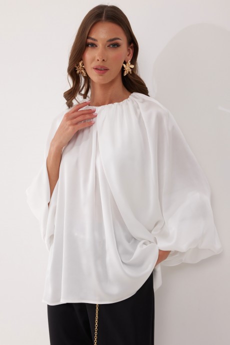 Стильная блуза прямого силуэта с акцентными рукавами. Горловина округлая, на спинке застежка на потайную молнию. По горловине сборка и декоративные складки. Рукав покроя реглан длинный и широкий, по низу собран на эластичную тесьму (резинку).