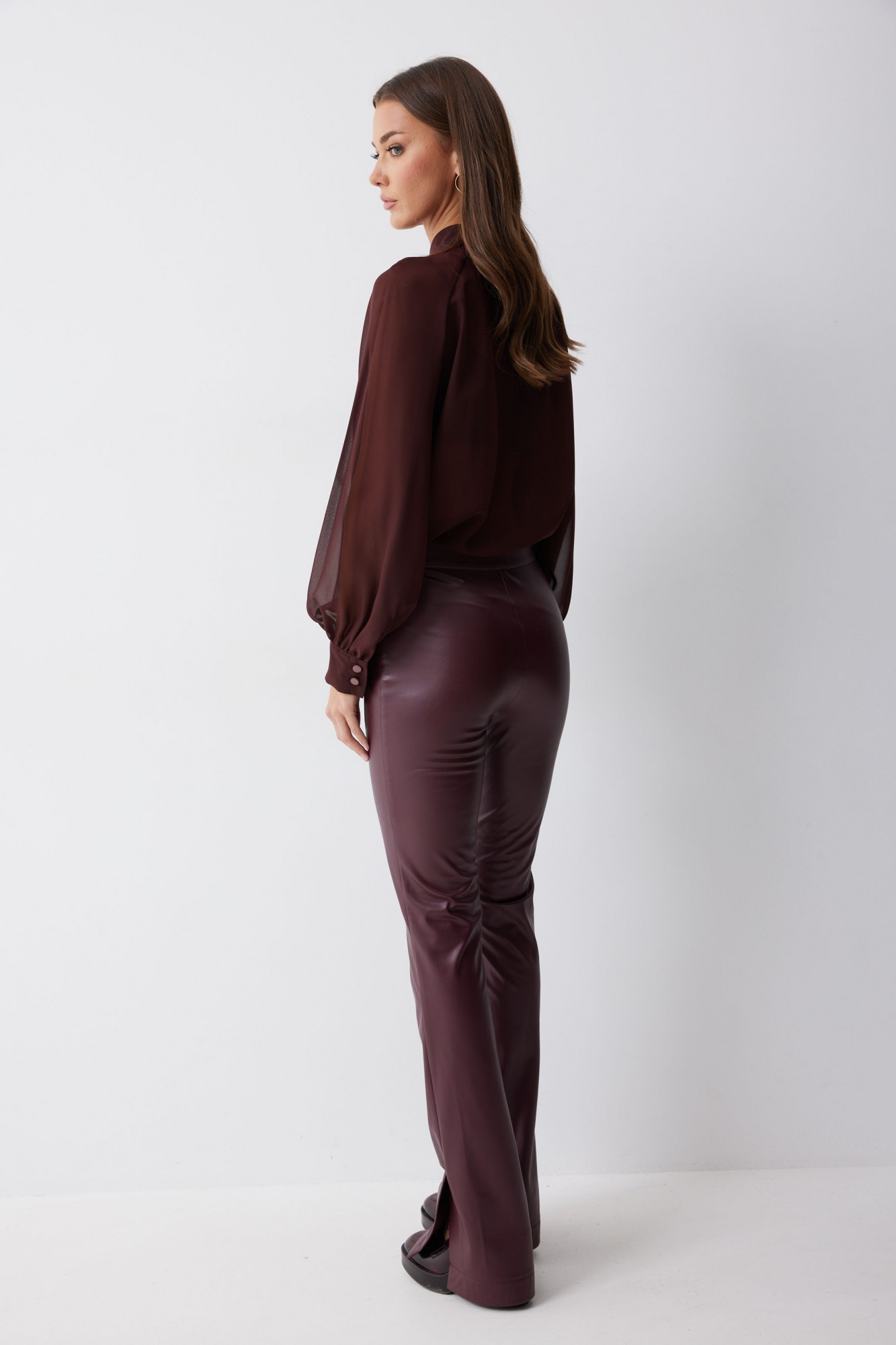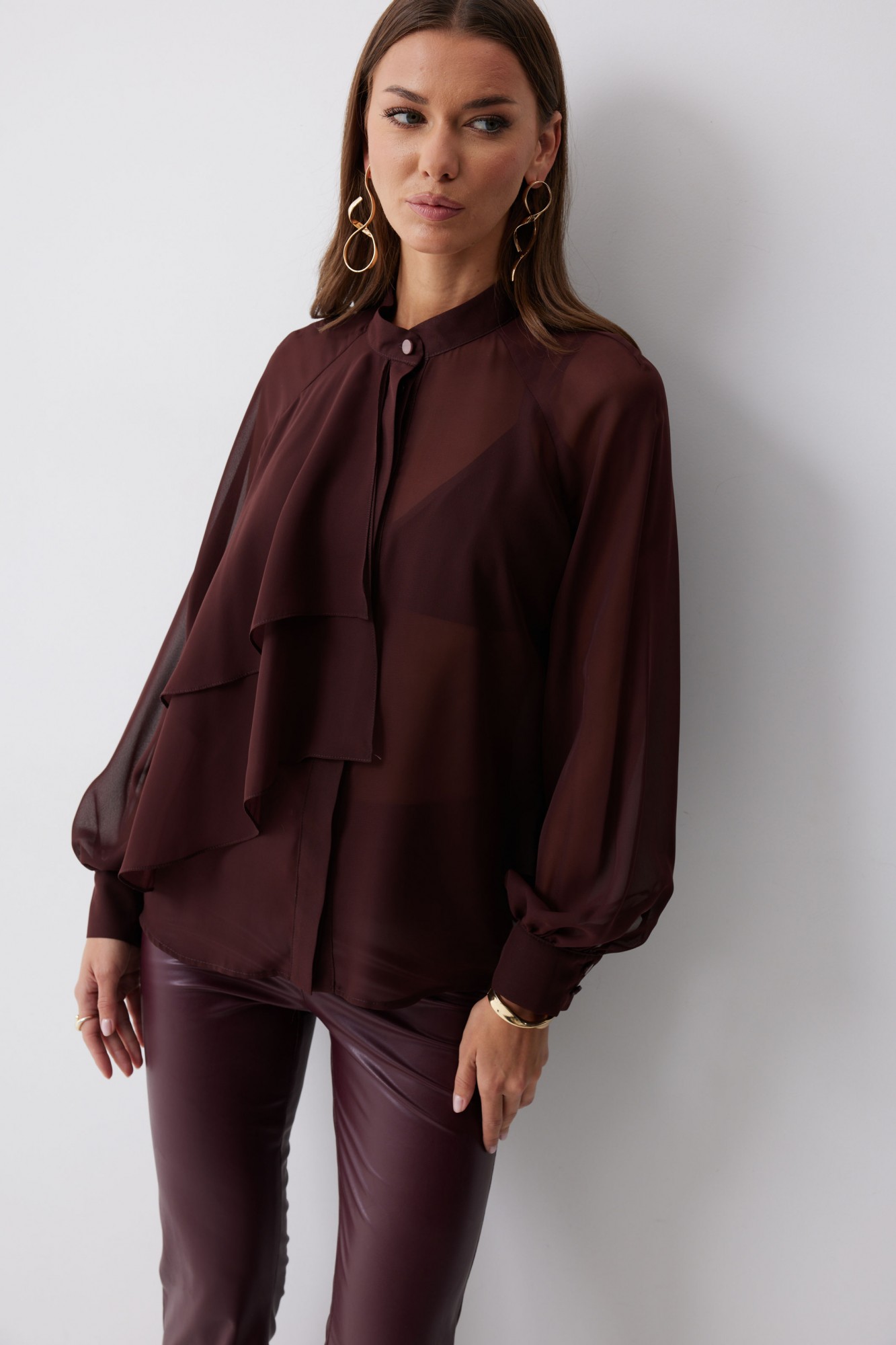 Стильная блузка полуприлегающего силуэта. Рукав – реглан, по низу на манжете со сборкой, застежка на петли и пуговицы. В правую половинку переда, в шов, вставлены декоративные воланы. Воротник-стойка, по центру планка с застежкой на петли и пуговицы.