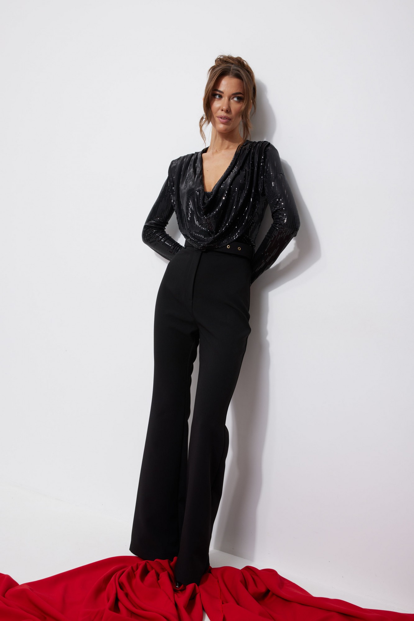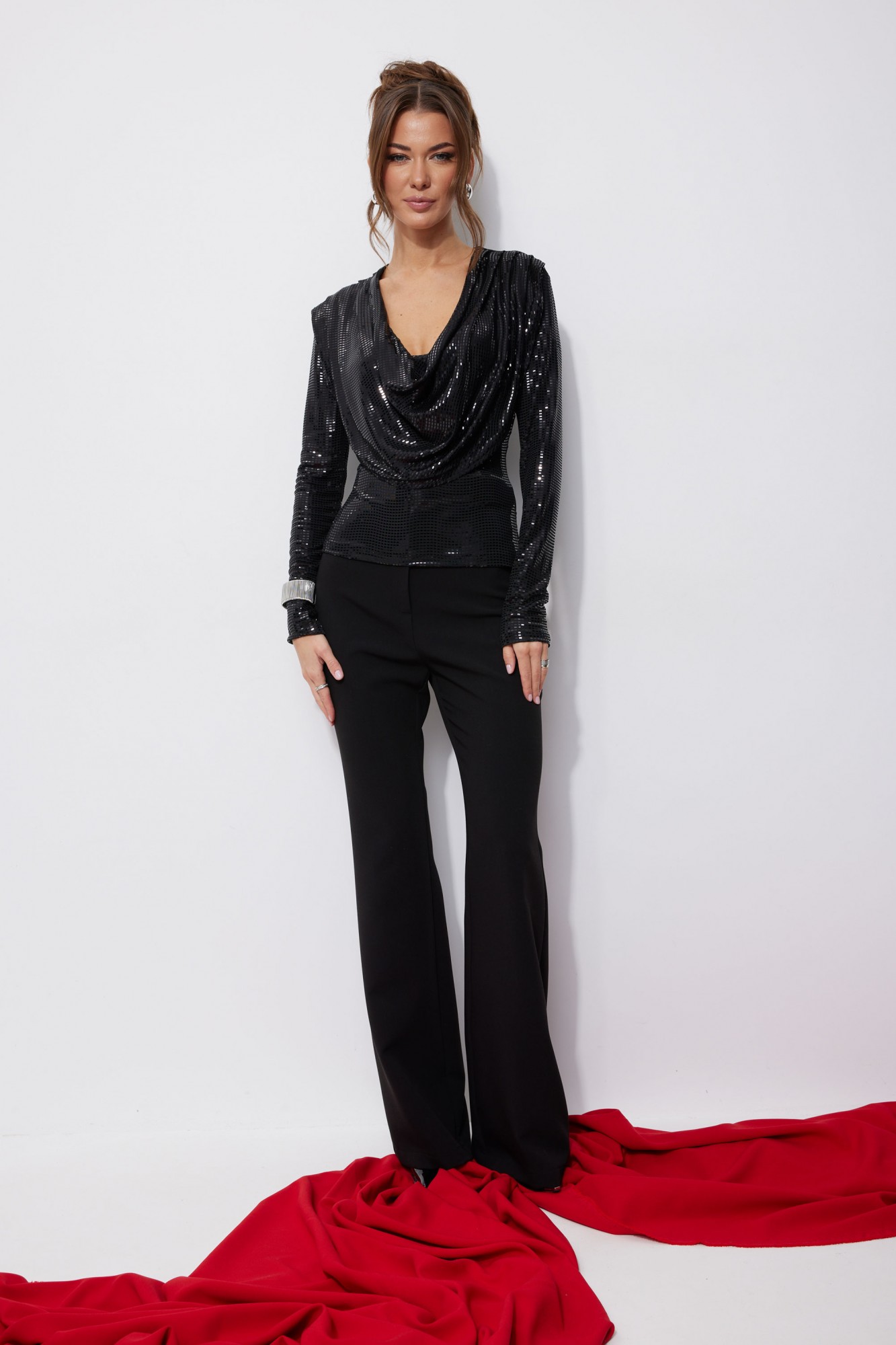 Блузка полуприлегающего силуэта из трикотажного полотна. По переду глубокий вырез и декоративная деталь ’качель’. Рукав втачной удлиненный.