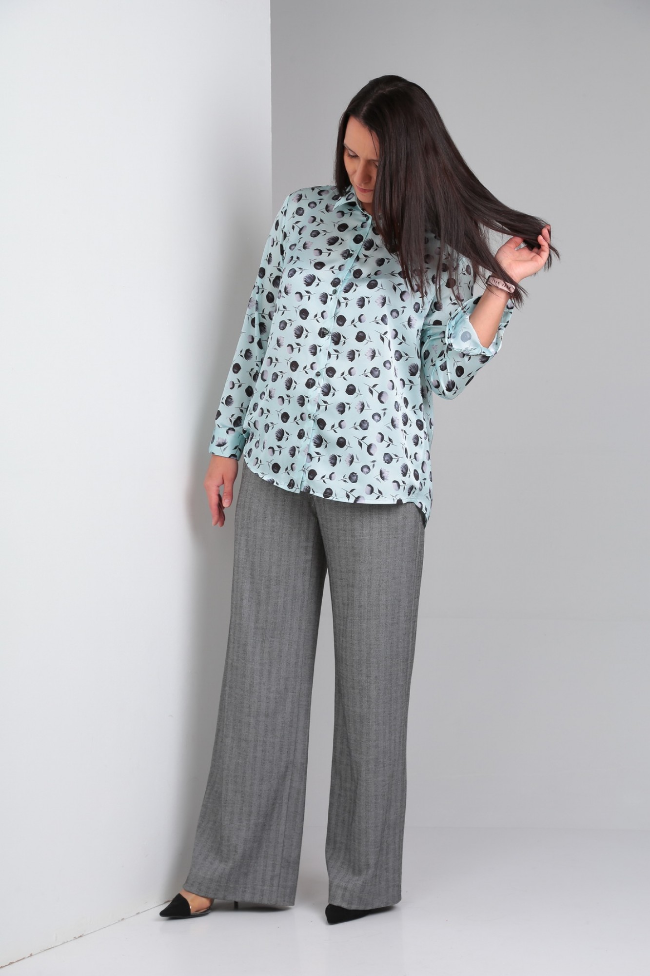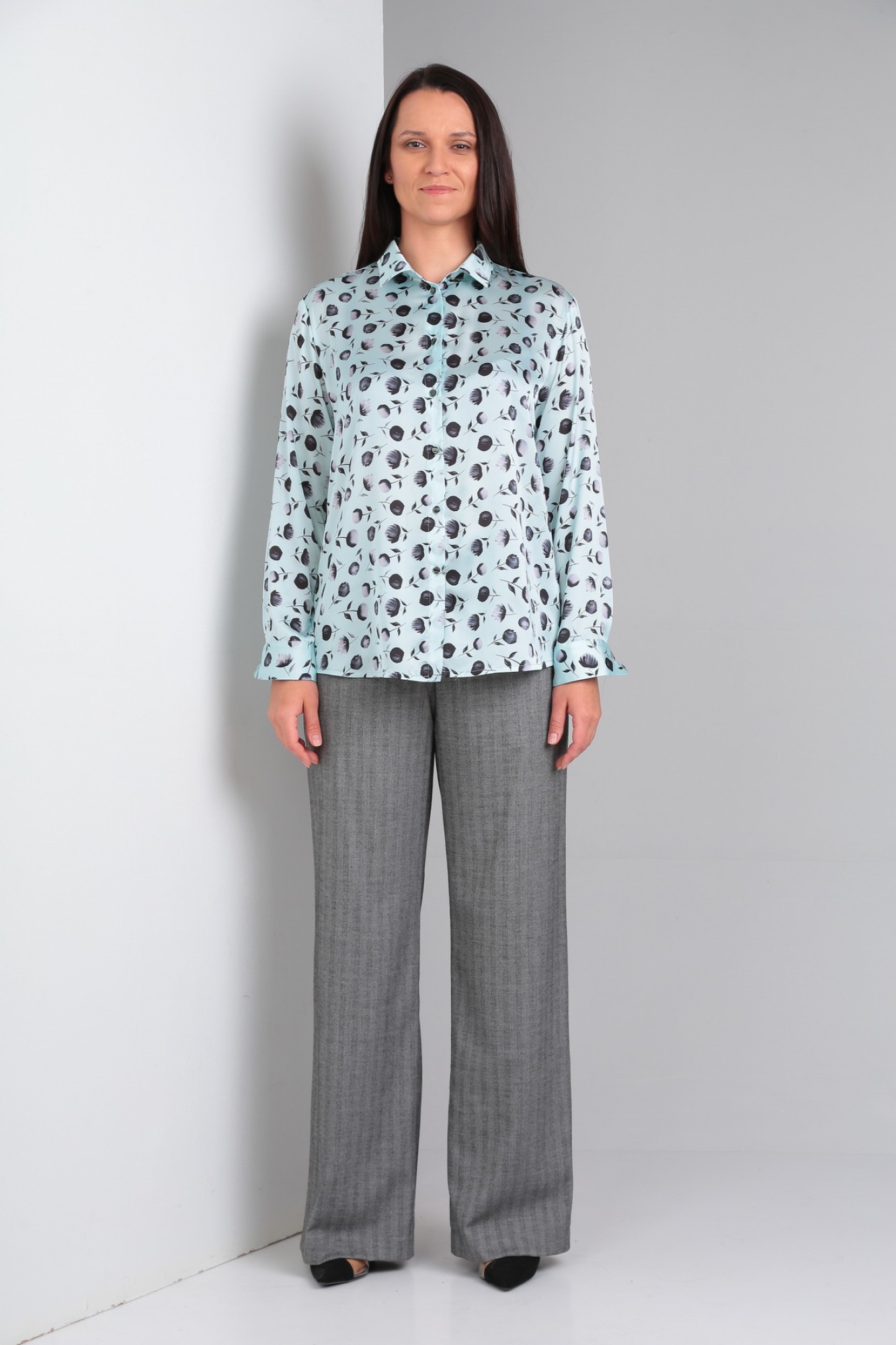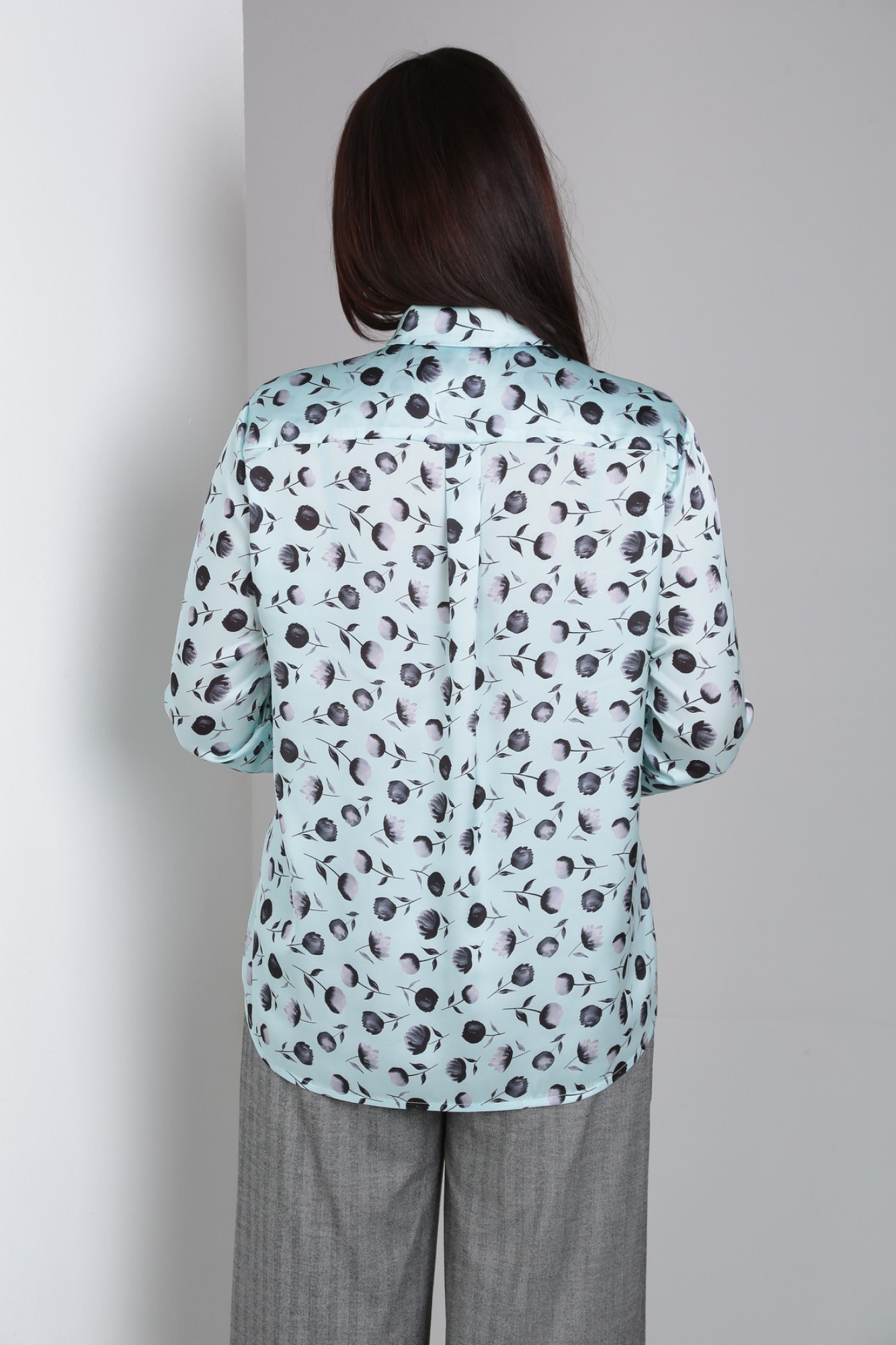 Рубашка свободного силуэта с длинным рукавом. По переду застежка на петли-пуговицы. В верхней части спинки кокетка. Воротник со стойкой, по низу рукава отрезная манжета.