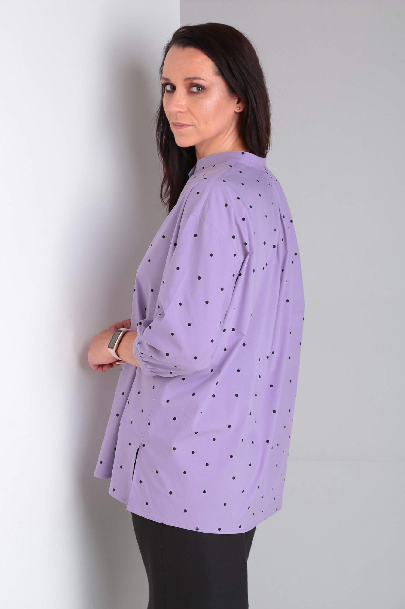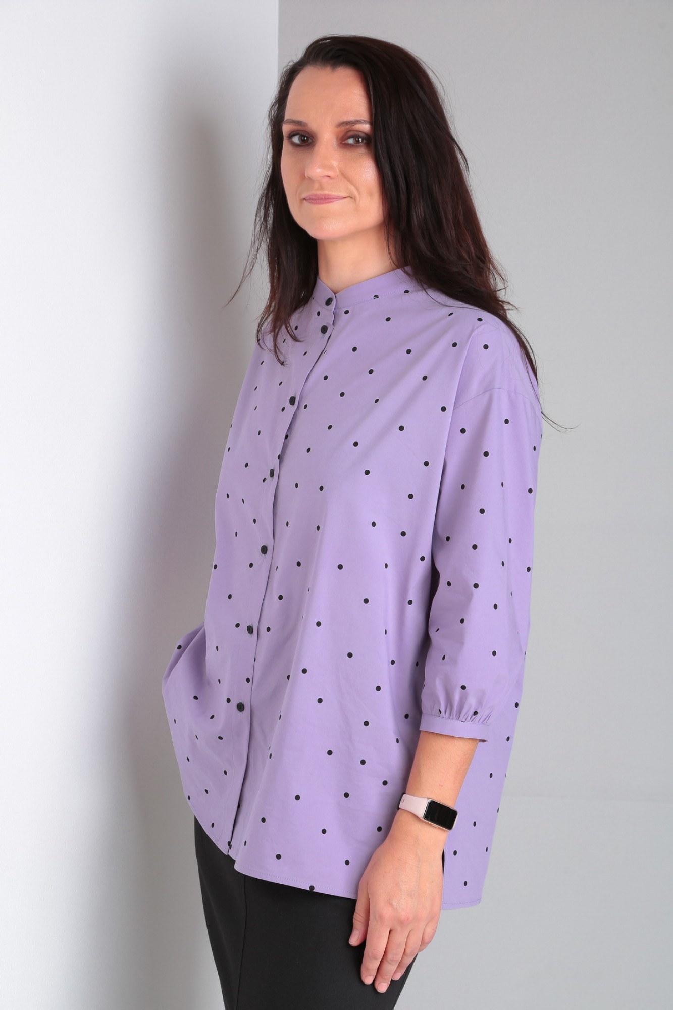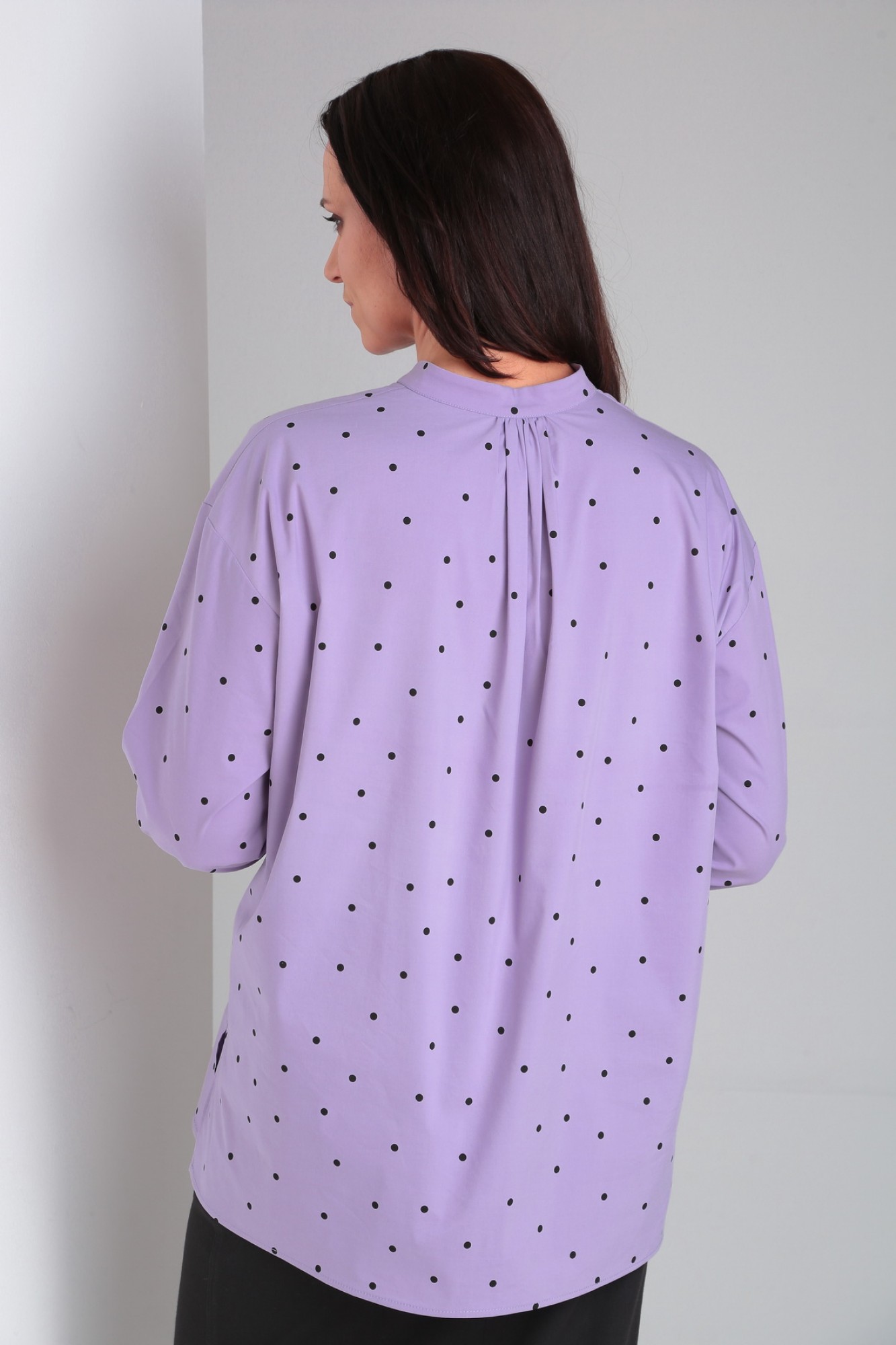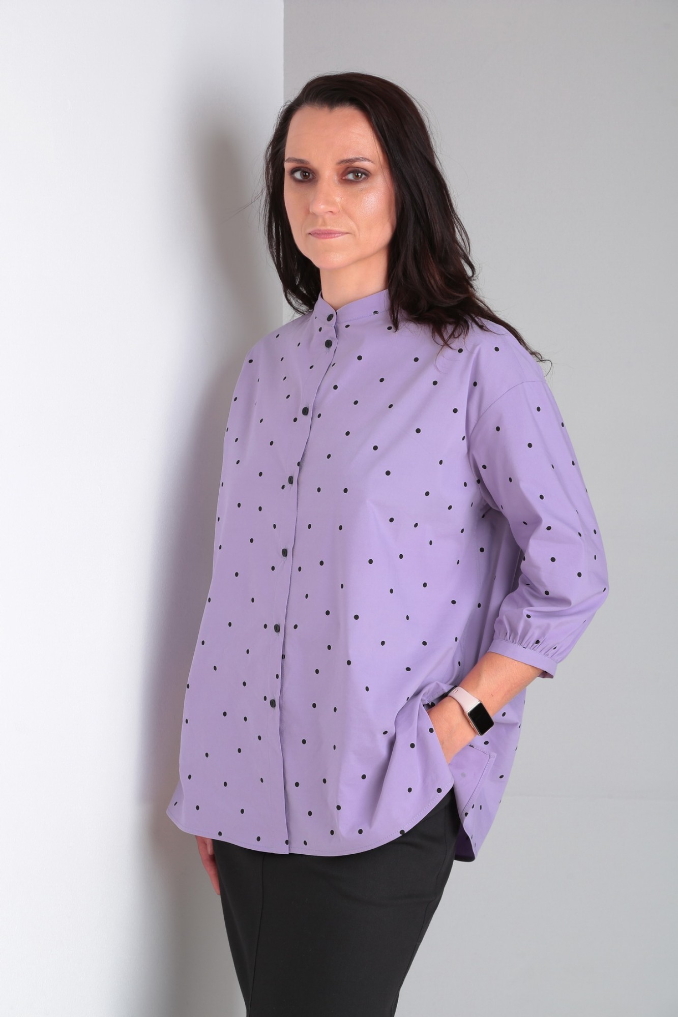 Рубашка свободного кроя с 3/4 рукавом и воротником на стойке. Застежка на петли-пуговицы.