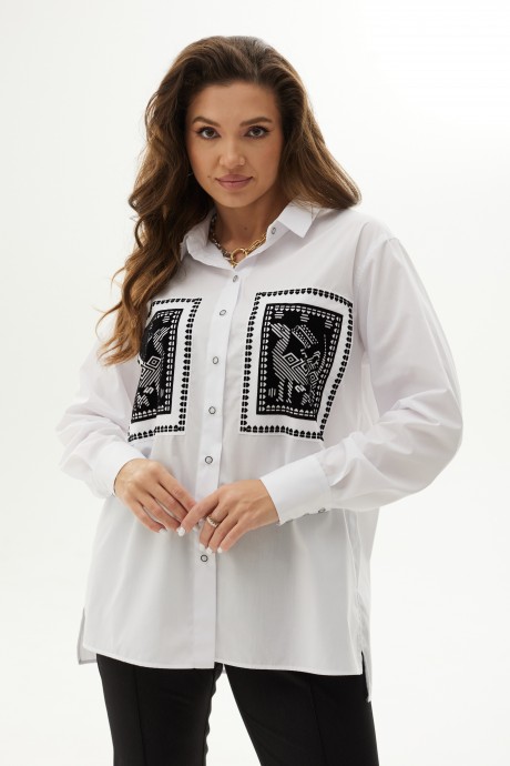 Блуза женская прямого силуэта со спущенным плечом, рубашечным рукавом с высокой манжетой. По спинке отрезная кокетка с выходящими складками. По переду нагрудные накладные карманы с принтом флоком. Вход в карман со стороны проймы. Воротник рубашечный с отрезной стойкой. Планка с застежкой на пуговицы. Низ блузки разноуровневый.
