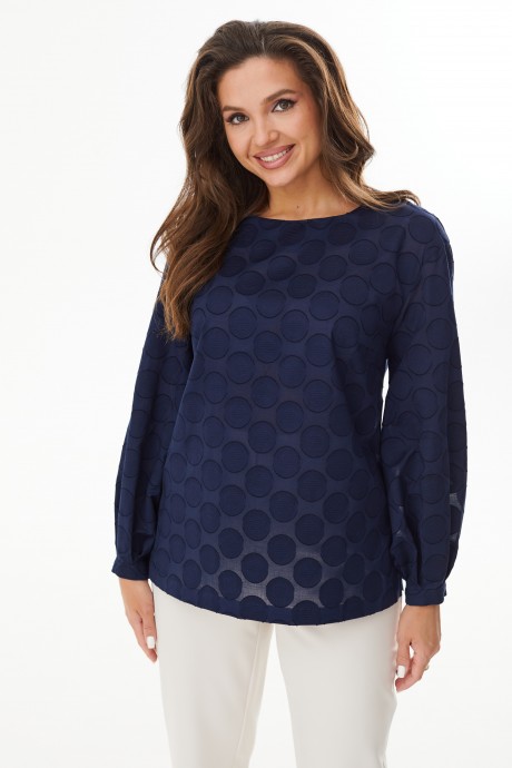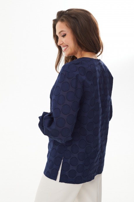 Блузка прямого силуэта. Горловина в форме закругленной лодочки. Рукав втачной, расширенный книзу, собран на манжету с застежкой-пуговицей. Снизу по бокам разрезы, застежка по горловине на 2 пуговицы и воздушные петли. В комплекте пояс.