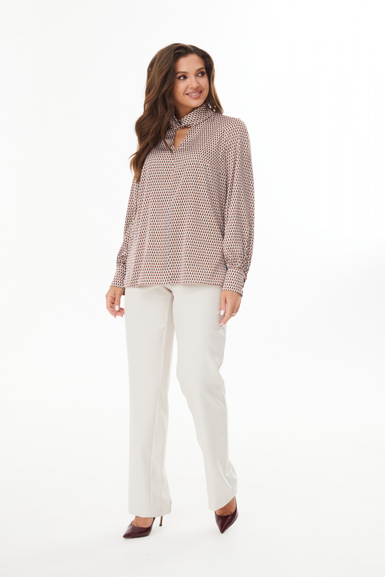 Нарядная блузка из атласной ткани. На полочке небольшой V-образный вырез и декоративная стойка. Спинка со средним швом и застежкой на молнию. В боковых швах по низу разрезы