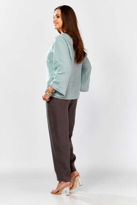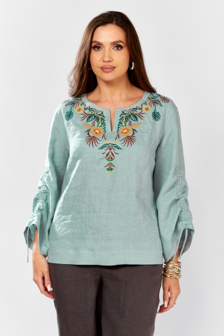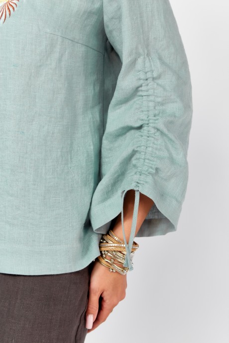 Блуза прямого силуэта. По переду нагрудные вытачки и декоративная вышивка. Плечо немного спущено. Рукав 3/4, расширен к низу, обработан кулиской. Горловина округлой формы с вырезом.