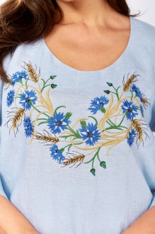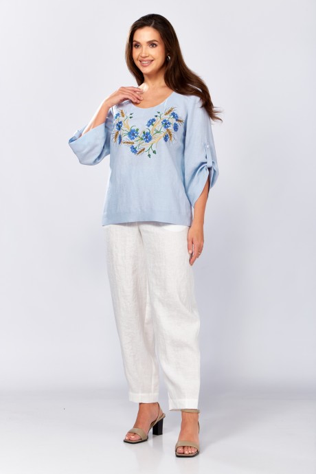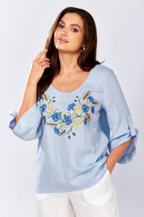Блузка прямого силуэта. По переду нагрудные вытачки и декоративная вышивка. Горловина округлой формы. В боковых швах разрезы. Рукав втачной, расширен к низу, с застёжкой на пату и пуговицу.