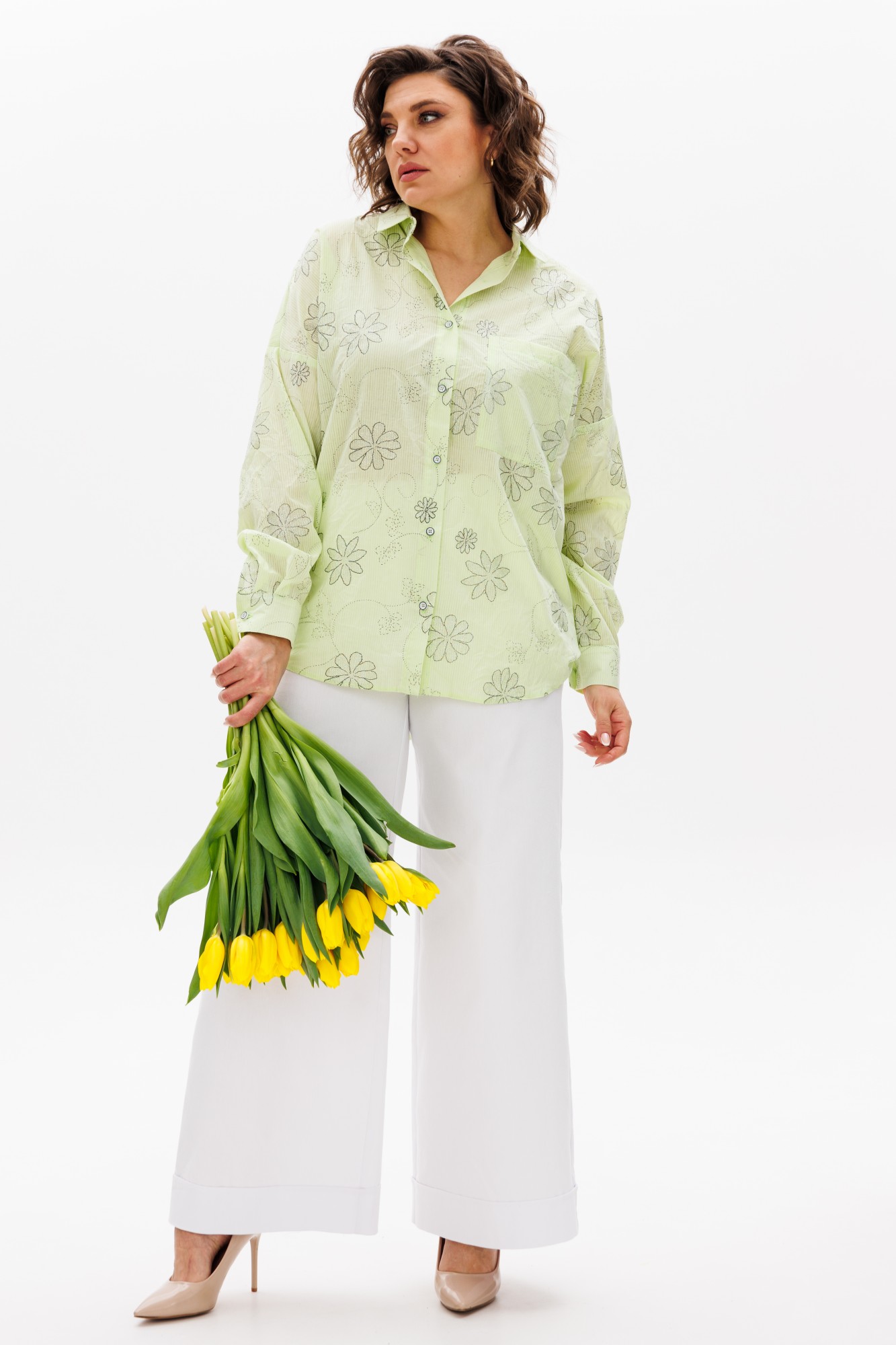 Нежная блузка свободного кроя, которая прекрасно вольется в повседневную жизнь и станет одной из любимых базовых вещей в Вашем гардеробе. Блузка выполнена из хлопковой ткани с имитацией «помятости» в цветок с ненавязчивым блеском. Спущенный длинный рукав, присобранный на манжету с пуговицами. По переду блузка застегивается на пуговицы, украшена накладным карманом. Спинка прямая, воротник классический. Изделие хорошо сочетается как с брюками, так и с юбками. Блузку можно носить как навыпуск, так и заправленной. Светлый цвет придаст Вашему образу женственности и нежности.
