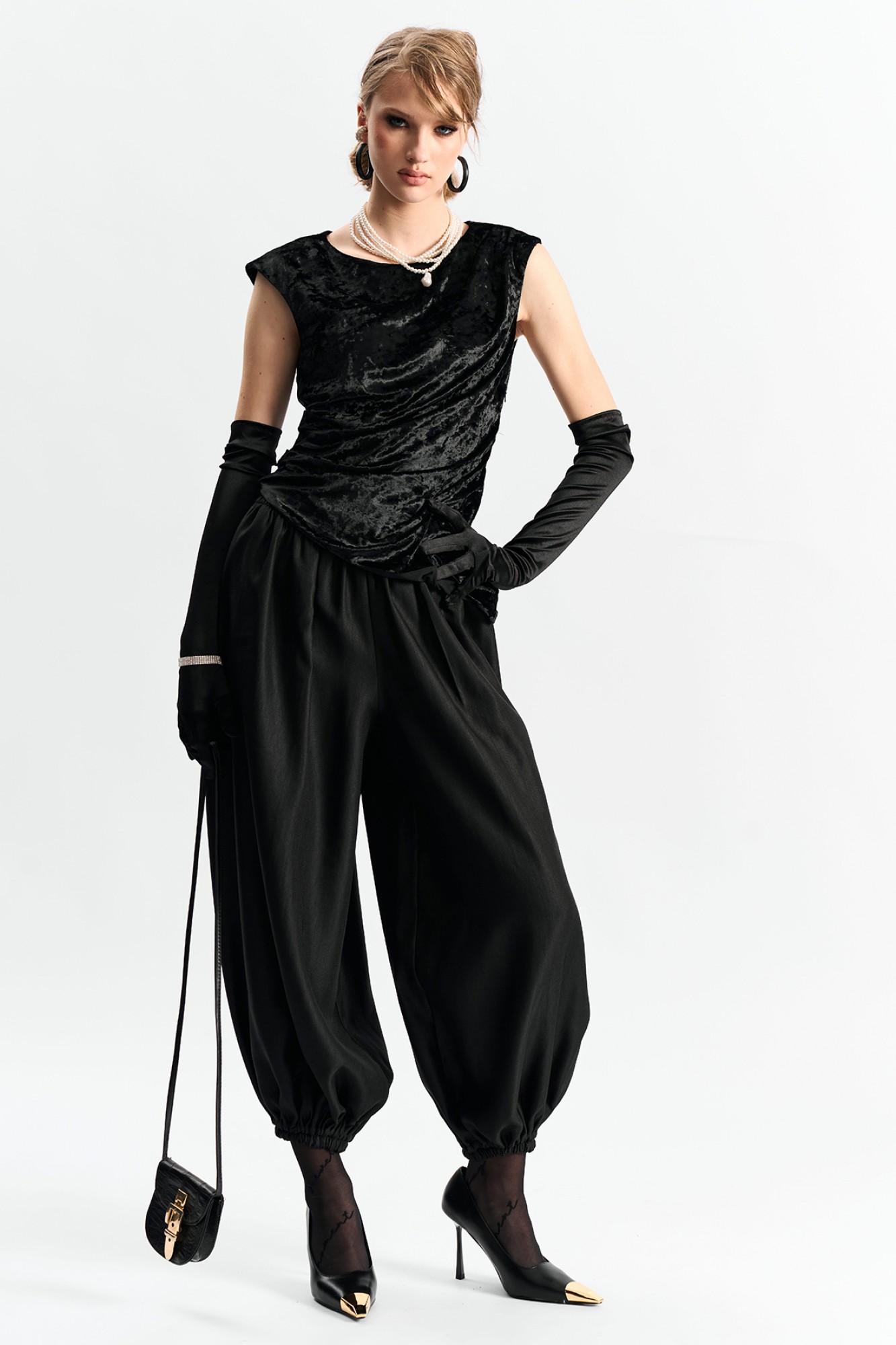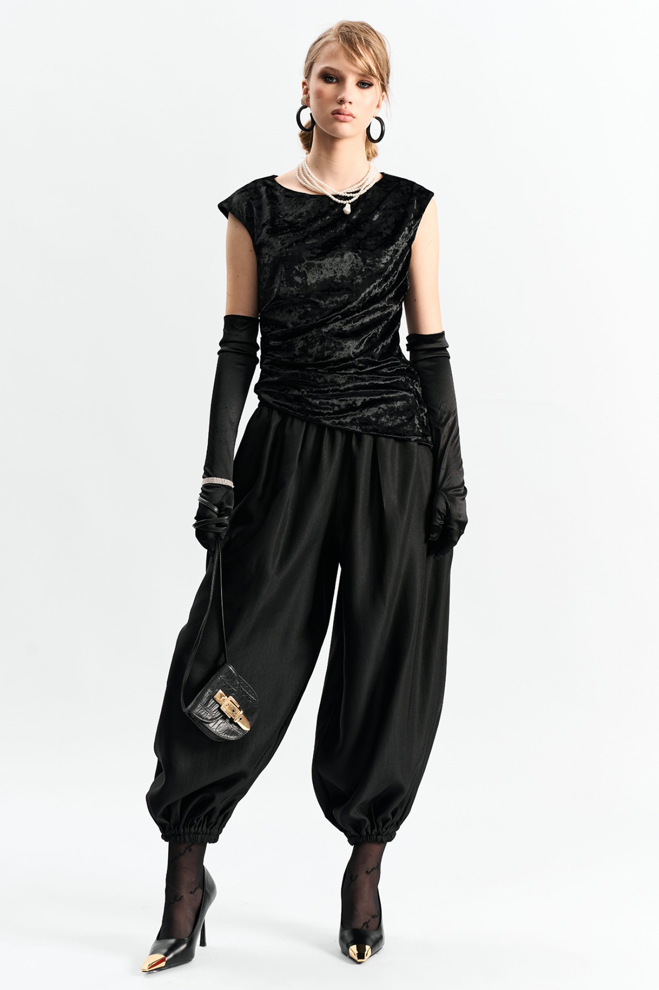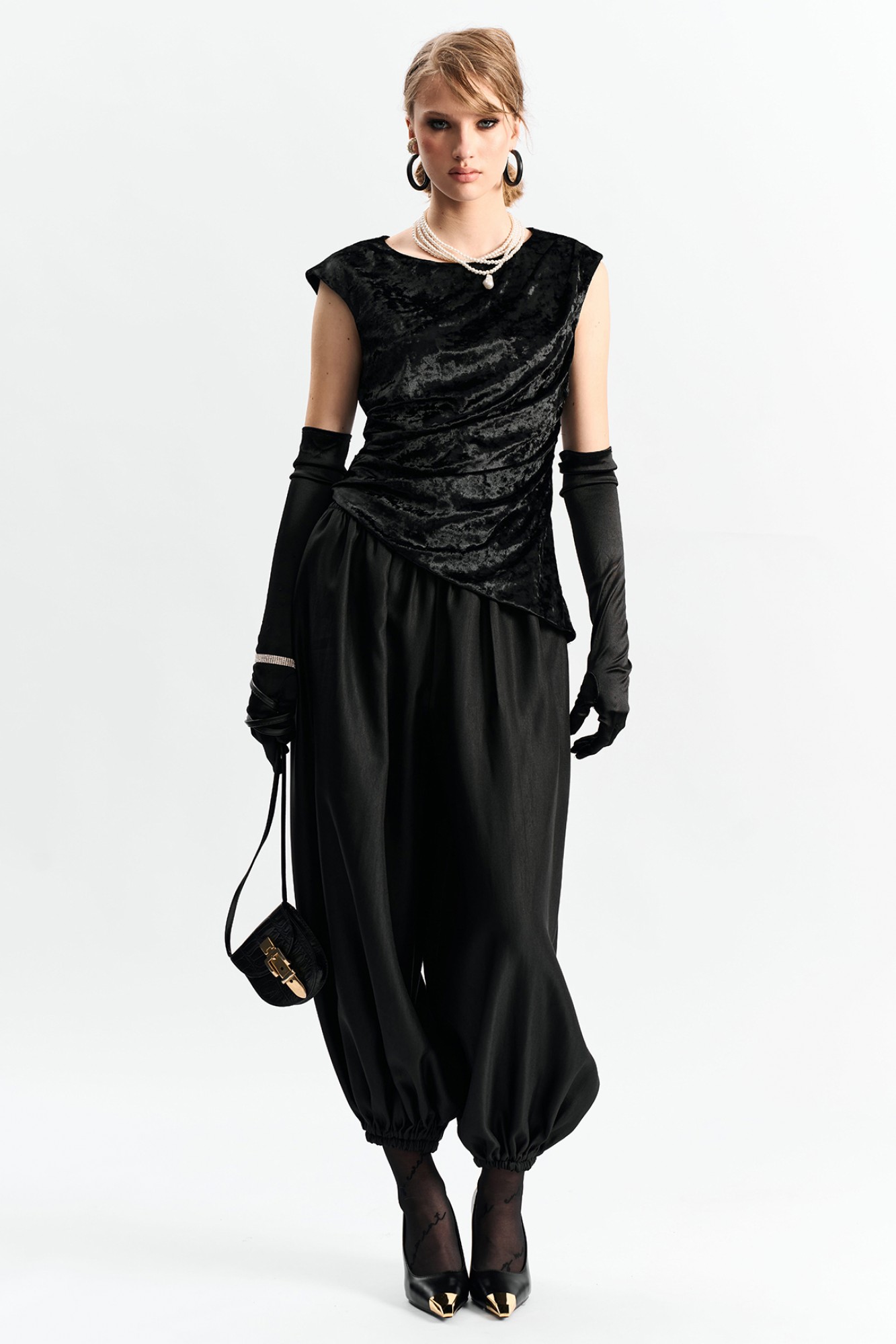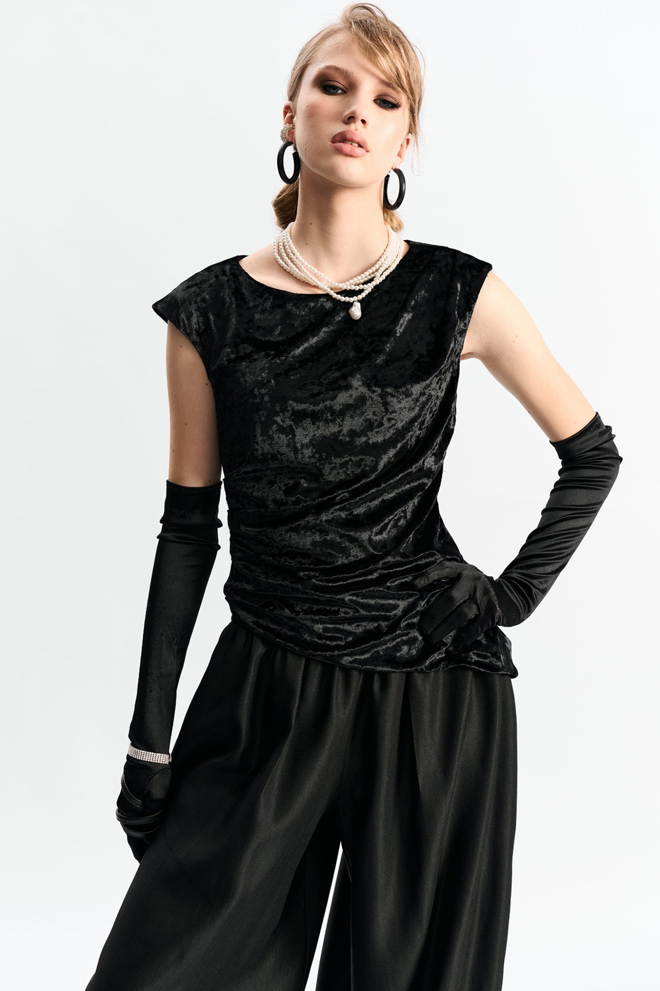 Блуза прилегающего силуэта, из фактурного бархата. Со складками по талии. Застежка-молния в боковом шве. Блуза на подкладке.