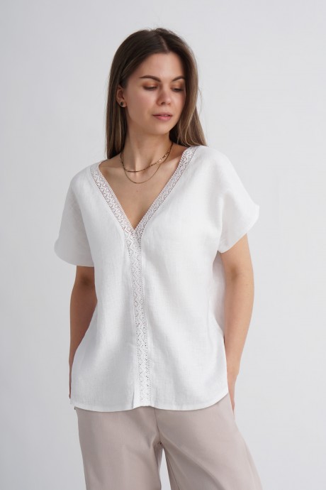 Блузка изготовлена из качественного мягкого льна с эффектом мятости свободного силуэта. Горловина V-формы с отделкой тесьма-шитьё из хлопка, рукав кимоно. Низ ассиметричен.