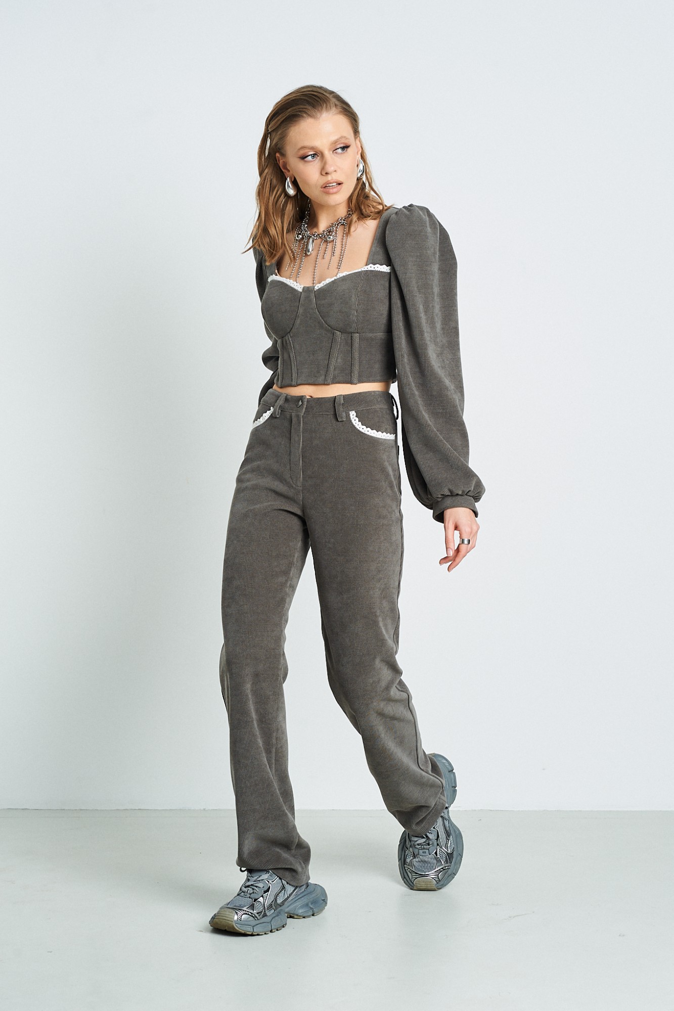 Топ из трикотажного вельвета. Лиф с чашками и регилином. Лиф декорирован тесьмой. Молния по спинке.