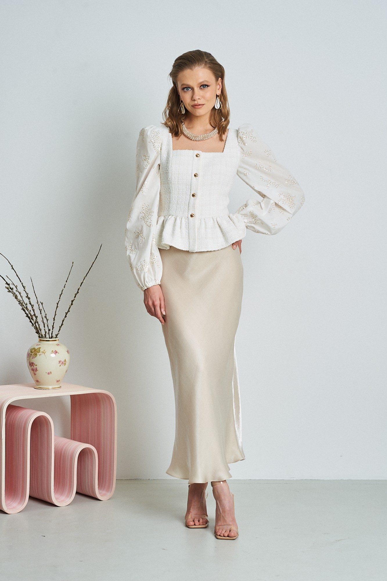 Топ из жаккардового полотна. Застежка на пуговицы. Топ на подкладке. Рукава из хлопковой ткани с вышивкой в золотистую пайетку.