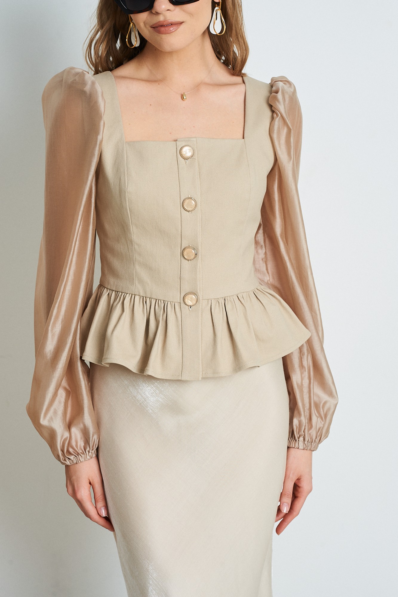 Топ из джинсового полотна. Застежка на пуговицы. Рукава из полупрозрачной ткани в тон.