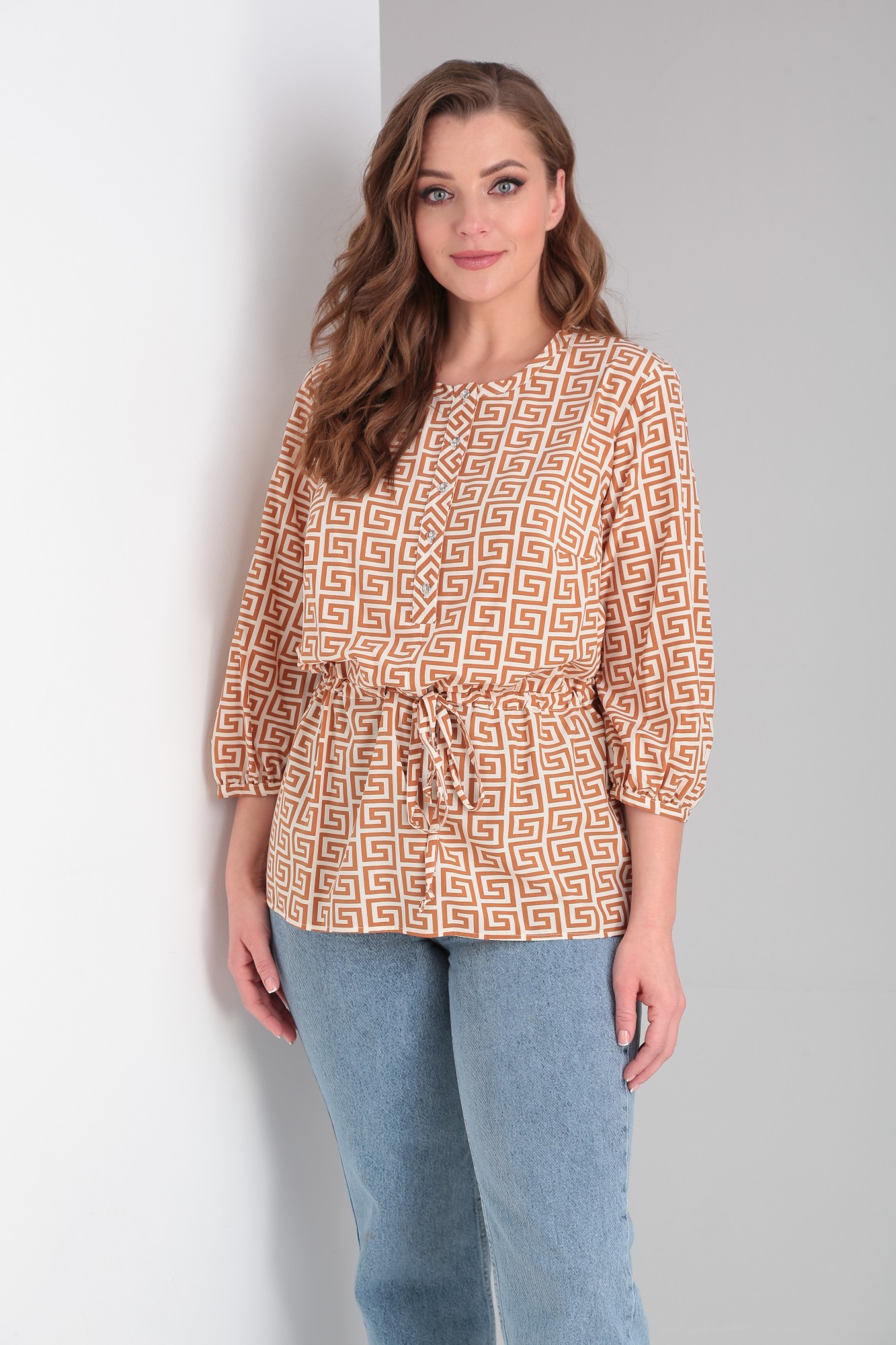 Блуза женская свободного покроя, отрезная по талии, полочка стачная с короткой планкой на застёжку, спинка стачная, на нижнюю баску изделия настрочена кулиса с поясом на завязывание, рукав прямой втачной со сборкой по нижнему срезу, горловина и рукав изделия окантованы широкой бейкой. Низ изделия обмётан и отстрочен отделочной строчкой.