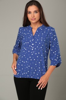 Женская блузка свободного силуэта с втачным рукавом. По переду изделия нагрудные вытачки и центральная планка, застегивающаяся на пуговицы. На левой полочке накладной карман. Спинка с кокеткой переходящей на полочку. По центру спинки сборка. Рукав короткий, прямой, втачной с патой на застежку пуговицу. По горловине плоско лежащий воротник-стойка. Низ блузки на резинке.