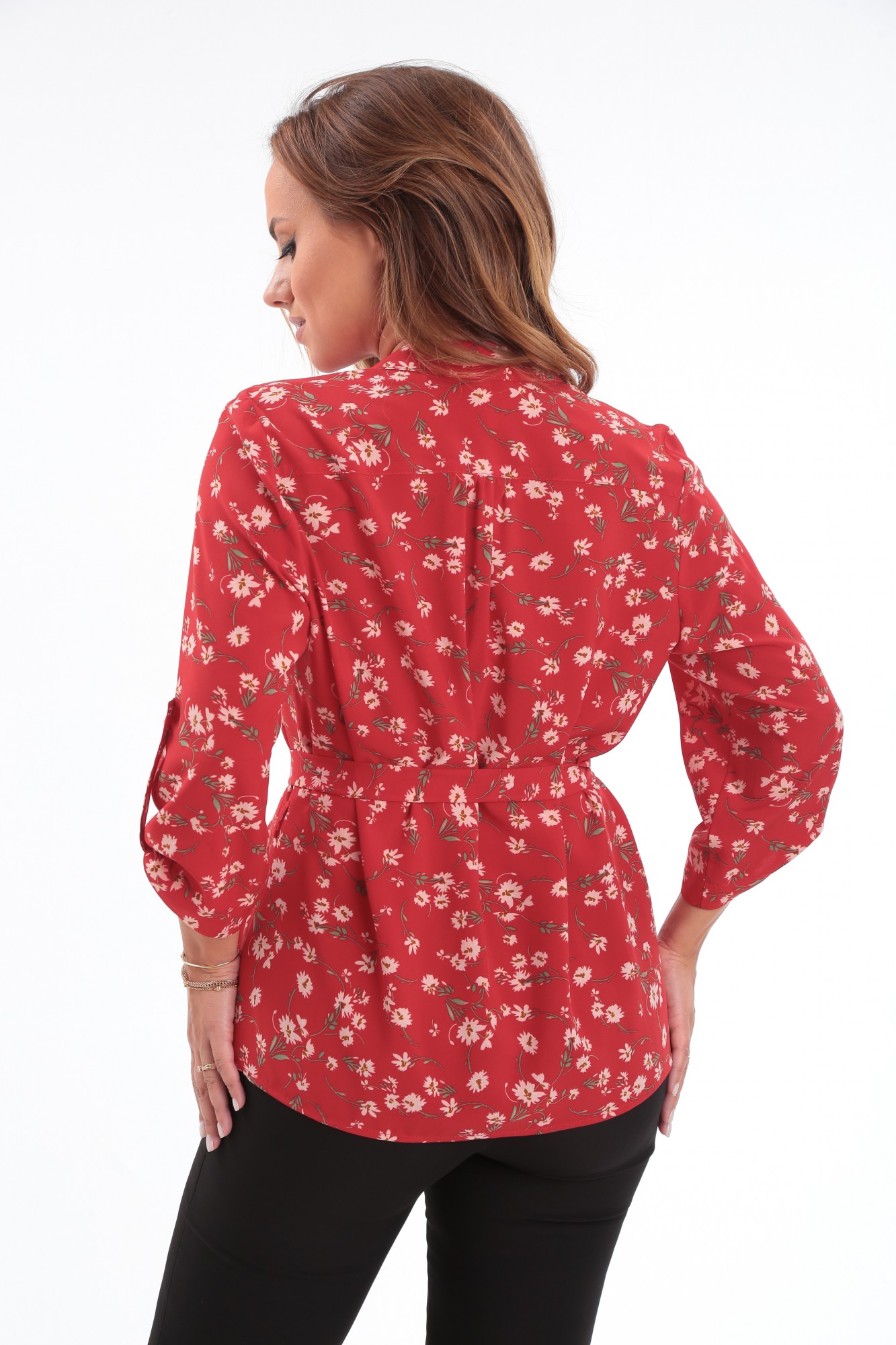 Женская блузка свободного кроя с втачным рукавом и поясом. Передние полочки изделия с нагрудными вытачками. Скругленная линия горловины, на полочке обработана застежка-поло на застежку пуговицы. Спинка с кокеткой переходящей на полочку. По центру спинки сборка. Рукав прямой втачной с патой на застежку. По линии талии на боковых швах шлевки для пояса из основной ткани.