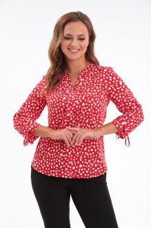 Женская блузка с V-образным вырезом. Модель c воротником стойкой. Рукав втачной длинной за локоть и шнуровкой-стяжкой. Передние полочки блузы с нагрудными вытачками. По спинке планка с застежкой на пуговицы.