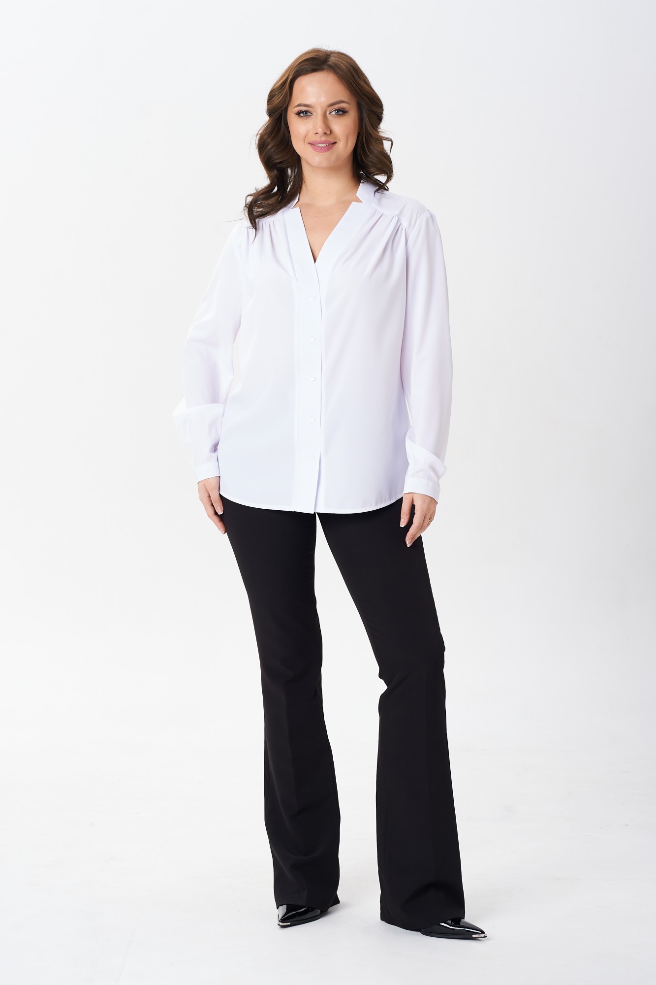 Женская стильная блузка свободного кроя. По переду и спинке цельнокроеная кокетка, а также сборка по притачиванию кокетки как спереди, так и сзади изделия. Воротник стойка переходящий в широкую планку на застежку петли пуговицы. Рукав длинный с манжетой на застежку петля-пуговица. Низ изделия фигурный.