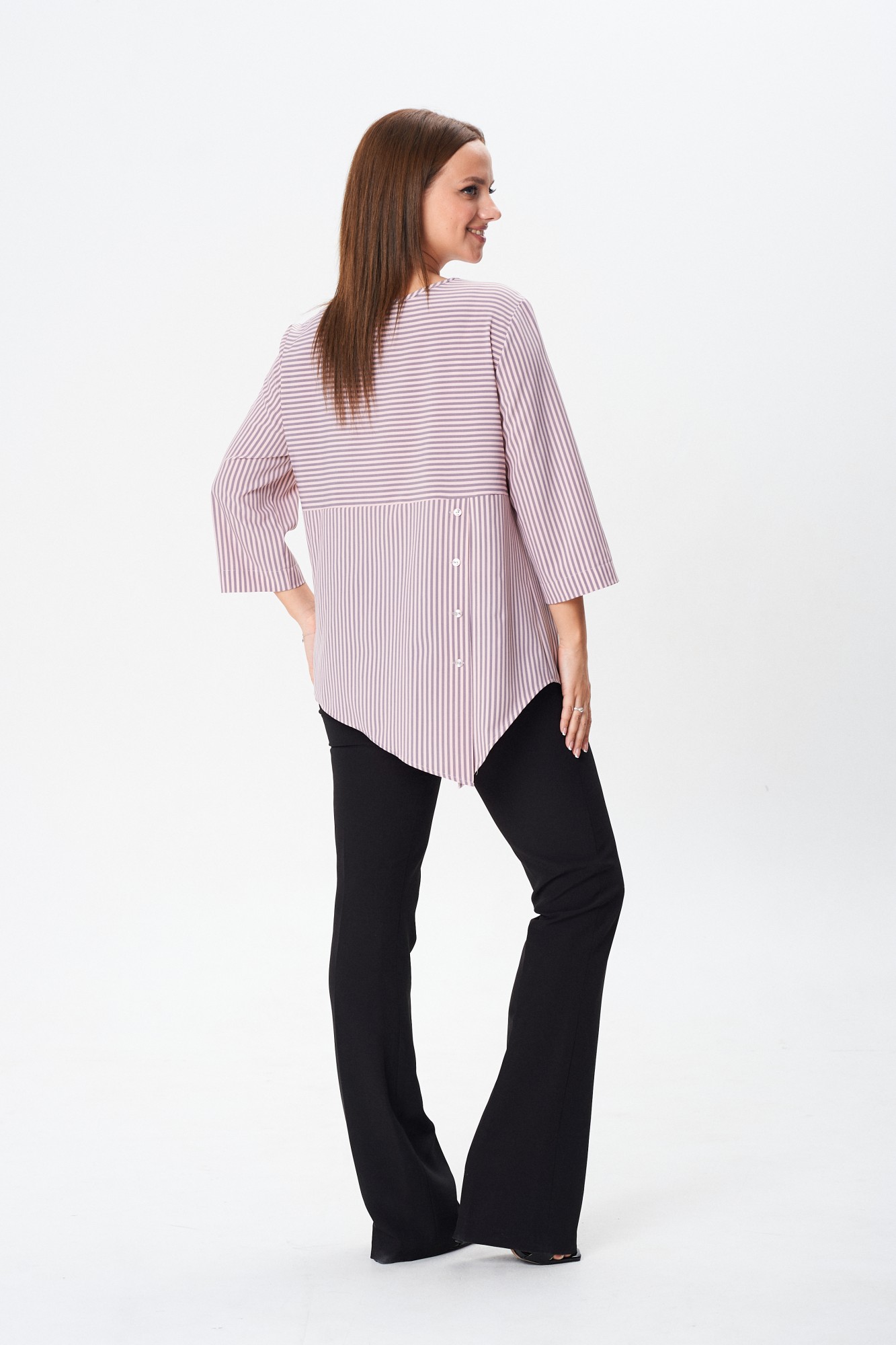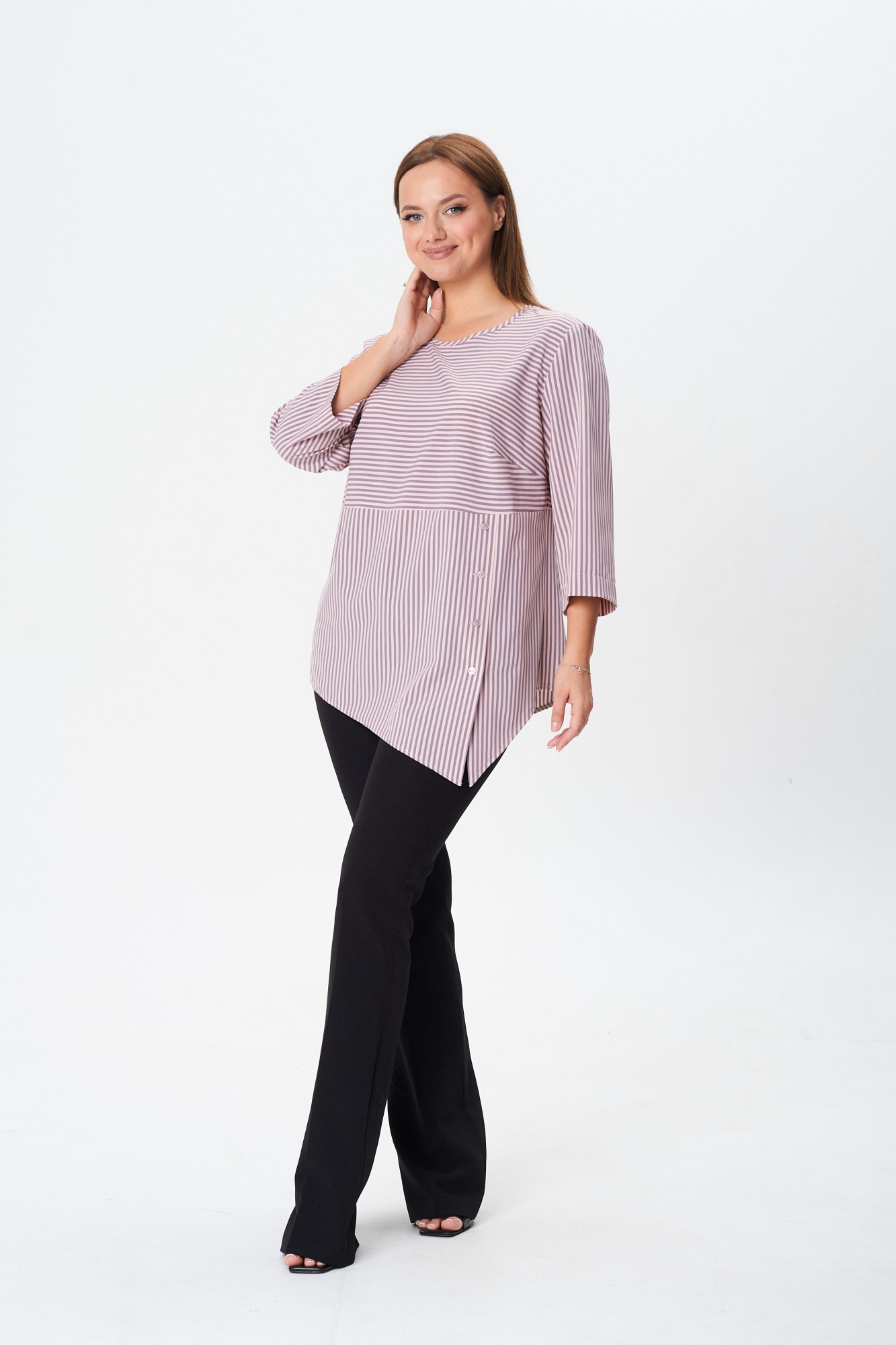 Стильная блузка с круглым вырезом горловины и нагрудными вытачками. По переду и спинке отрезная по линии талии. Нижняя часть блузки с ассиметричным фигурным низом как спереди, так и сзади и функциональной застежкой на петли пуговицы. Рукав в тачной длинной за локоть.