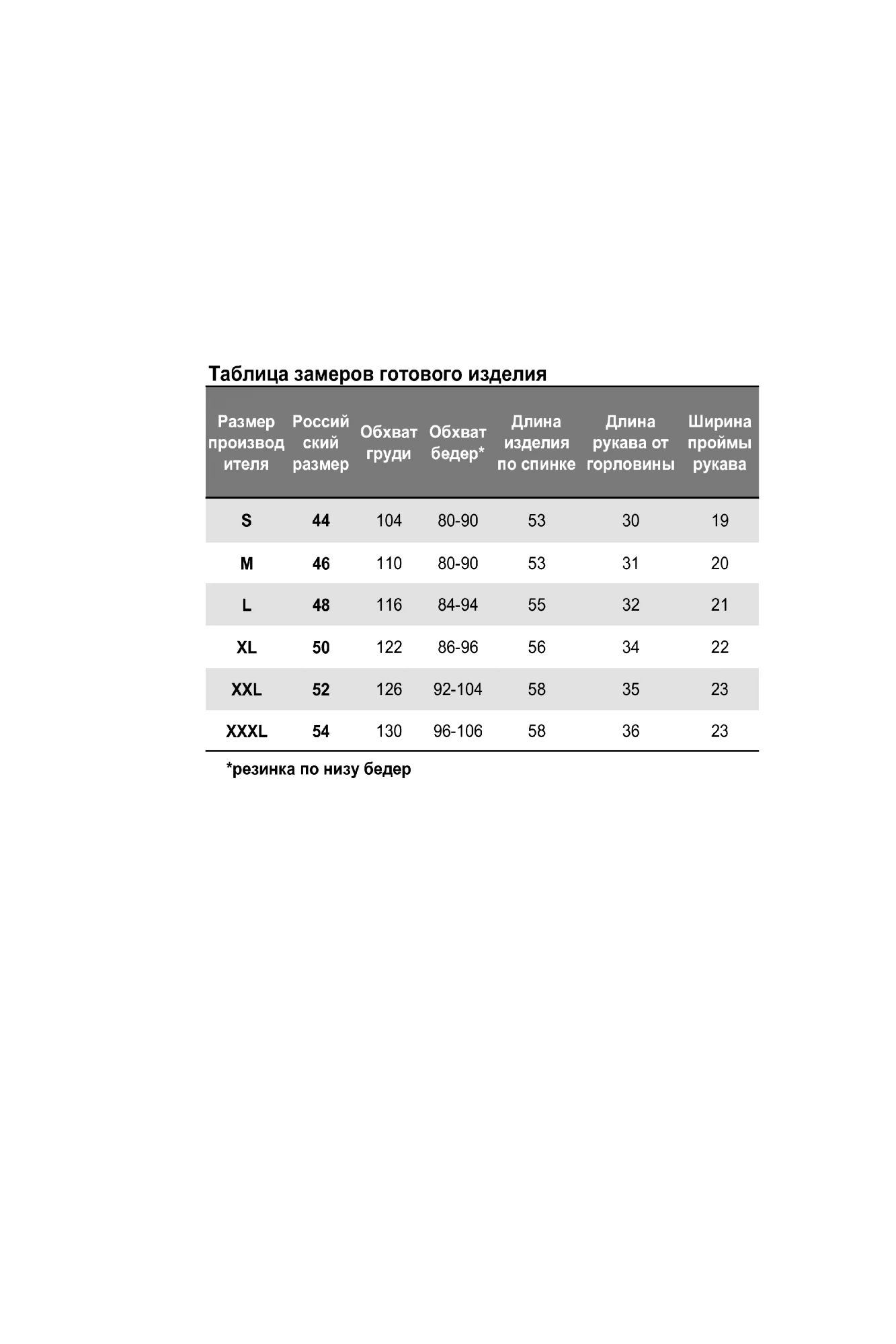 Таблица размеров