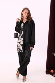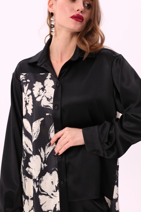 Блуза свободного прямого кроя из комбинированной ткани. Воротник стояче-отложной рубашечного типа, застёжка центральная на петли и пуговицы. Рукав втачной одношовный с притачной манжетой на петлю и пуговицу. Спинка с отрезной кокеткой, нижняя часть спинки декорирована трикотажным гофре. Низ изделия по переду ассиметричный.