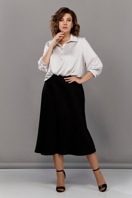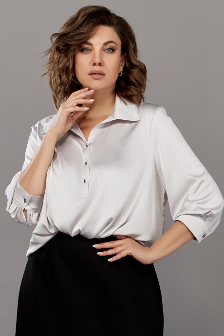 Блузка из мягкого блузочного атласа, прямого силуэта, с рубашечным воротником и застежкой на три пуговицы на планке до середины блузки. По переду блузка удлинена и низ переходит в завязку. Рукав трехчетвертной на манжете, на одну пуговицу.