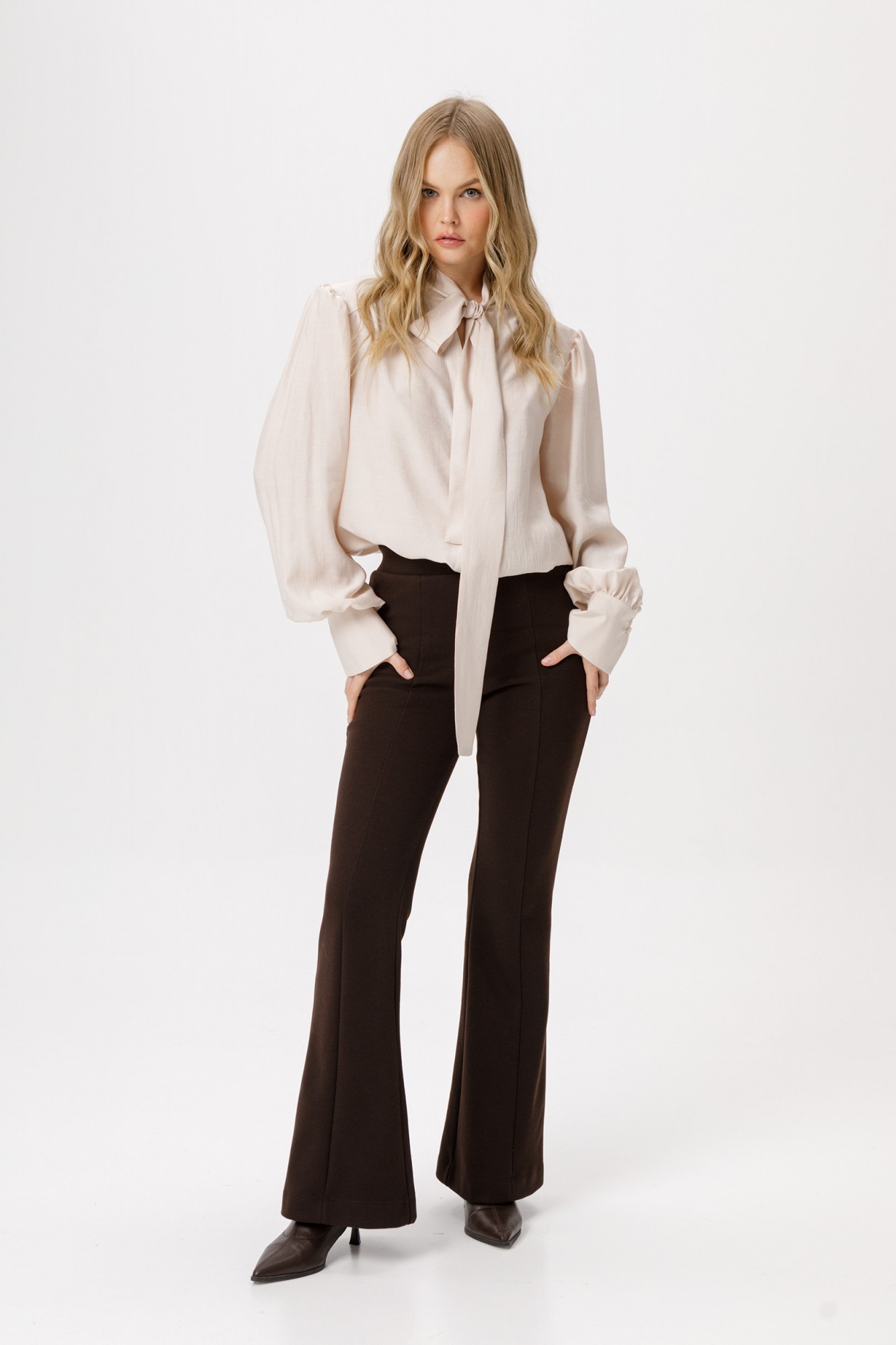 Блуза из полупрозрачной вискозы свободного силуэта с воротником-бантом. Детали: прямой силуэт, воротник-стойка переходящий в бант, кокетка переда и спинки, V-образный вырез с застежкой на петли и пуговицы, рукава втачные со сборкой и широкими манжетами.