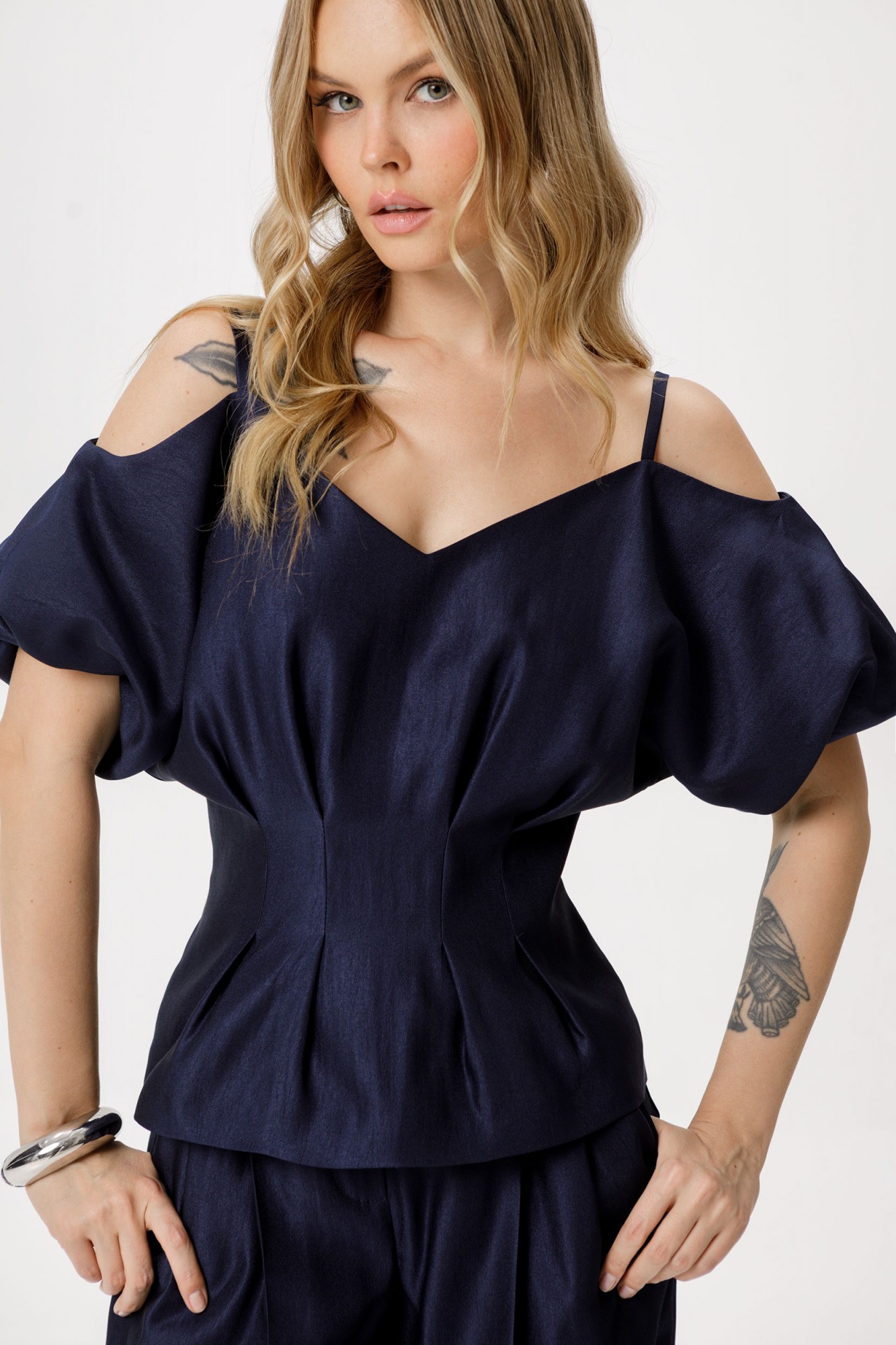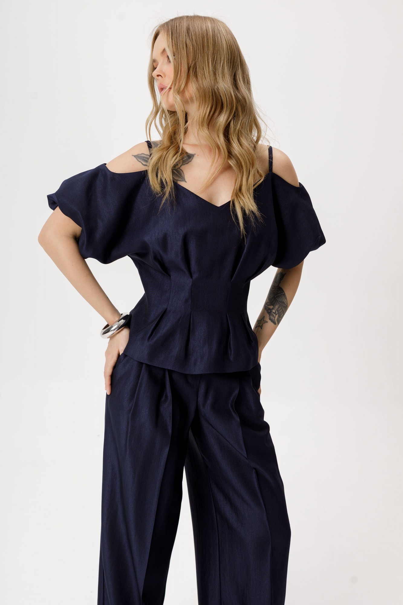 Приталенная блуза со складками. Детали: приталенный силуэт, застроченные складки по линии талии, V-образный вырез переда и спинки, рукава короткие цельнокроеные с вырезом по плечу, застежка на потайную молнию по спинке, на подкладке.