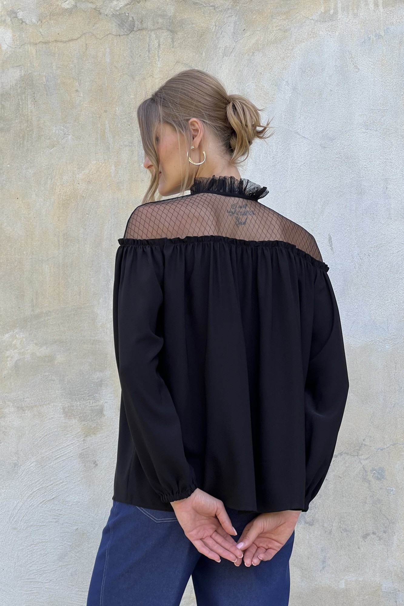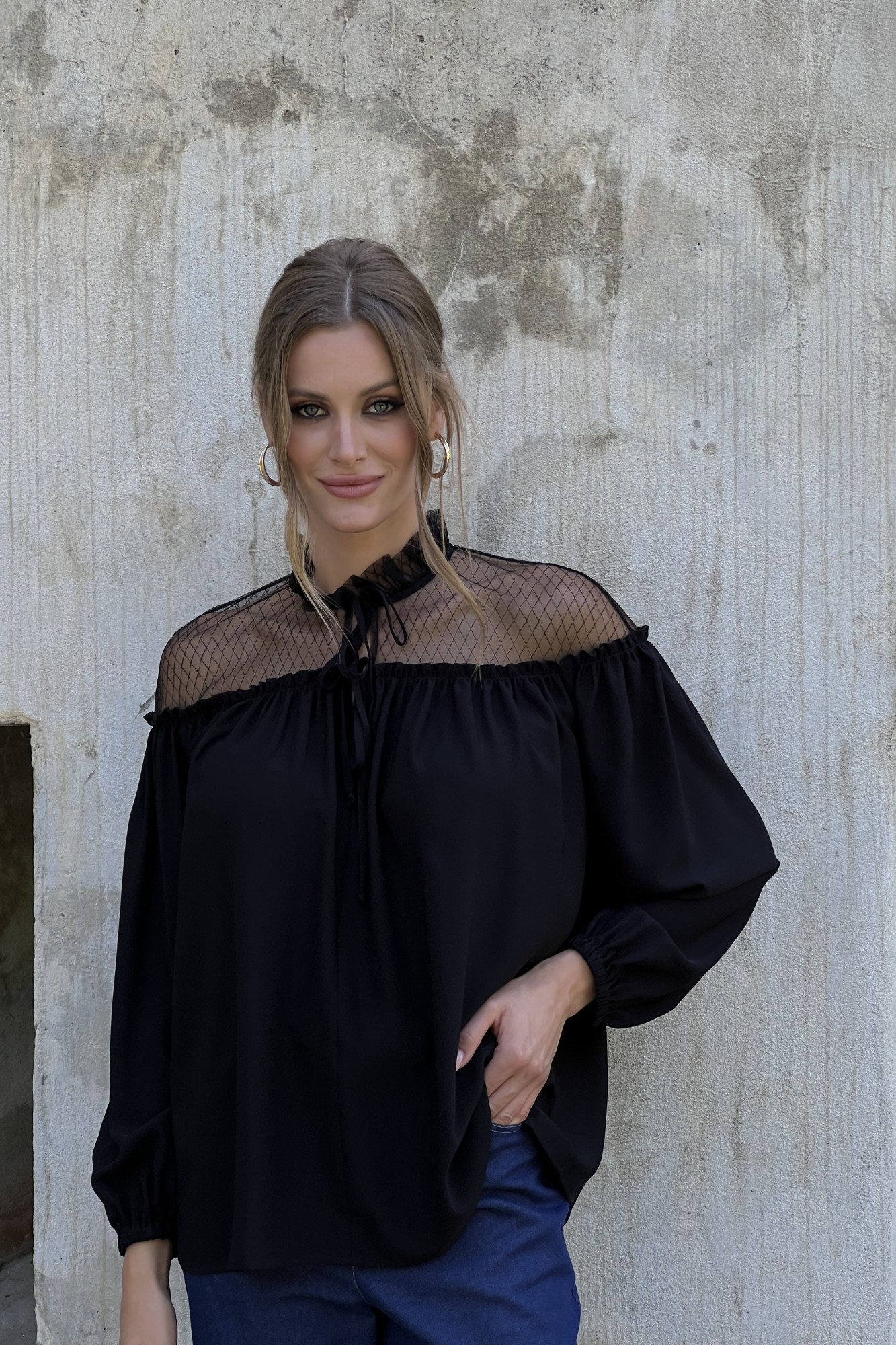 Блузка прямого силуэта, воротник стойка рюша. Рукав свободный, с рюшей вверху и фиксацией на резинку по низу. Рюша по переду переходит на спинку и перед.