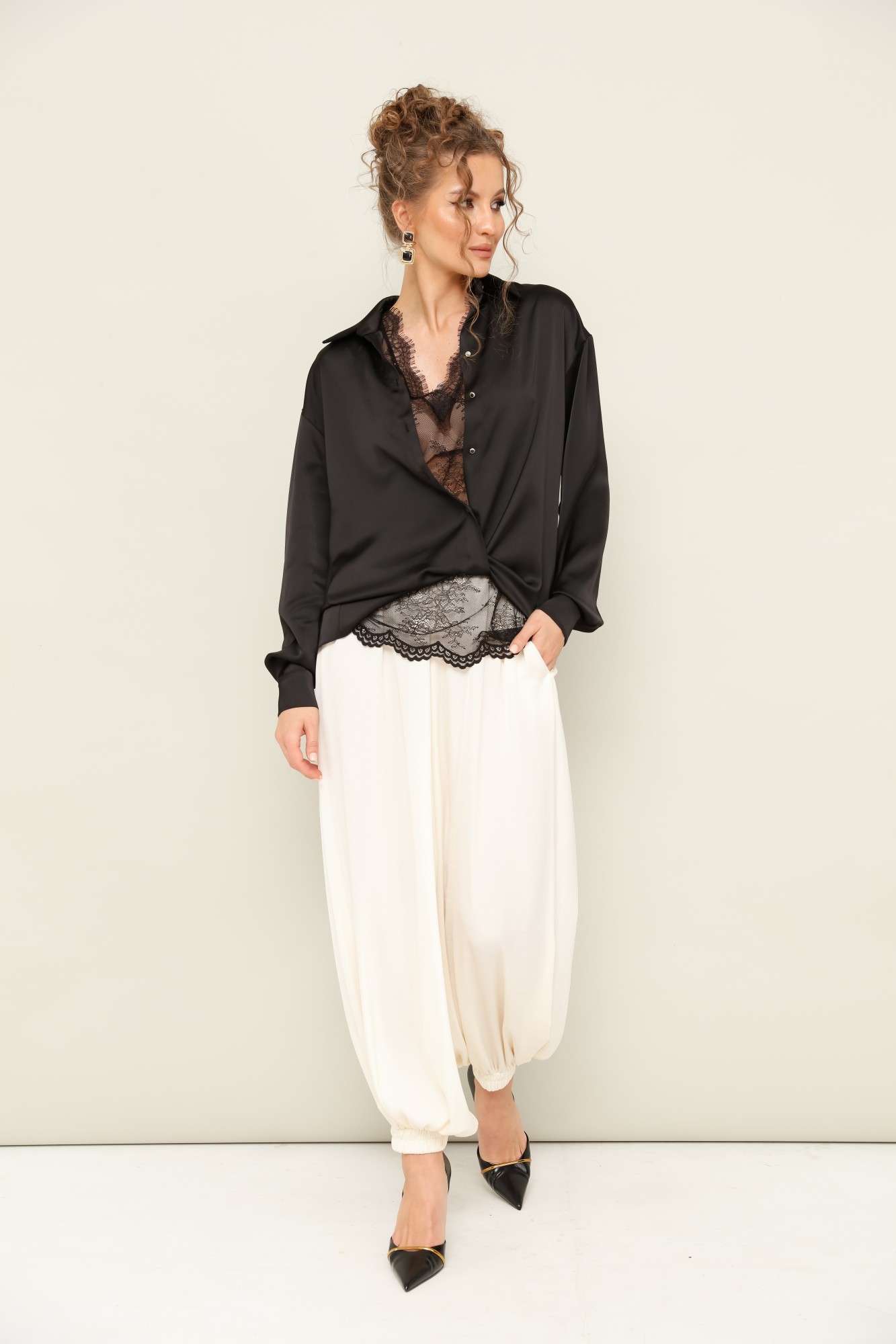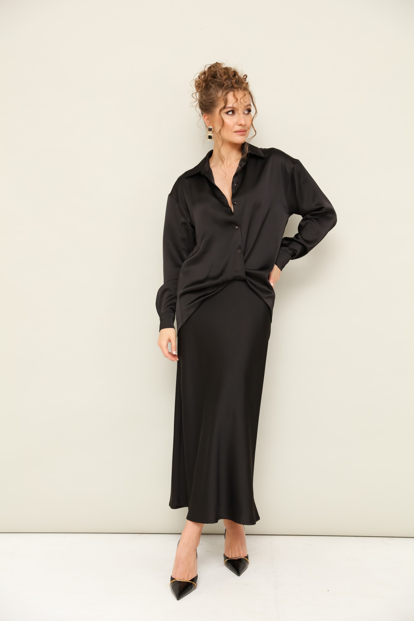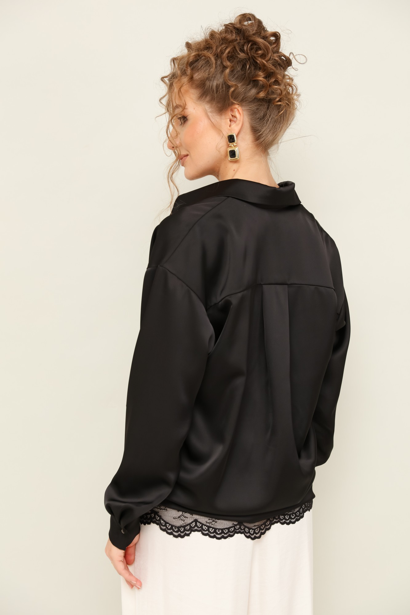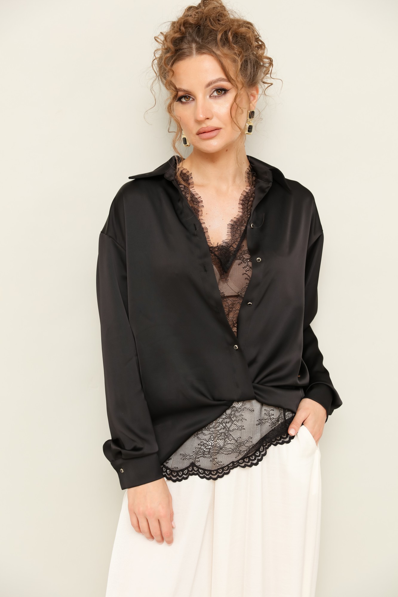 Элегантная блузка прямого кроя, выполнена из струящейся ткани с благородным матовым блеском. Горловина с рубашечным воротником на отрезной стойке, центральная застежка на петли и пуговицы. Перед блузки выполнен с декоративным перекрутом в нижней части застежки. Рукава со спущенной линией втачивания плеча, манжеты с застежкой на петли и пуговицы. Спинка с отрезной кокеткой и бантовой складкой.