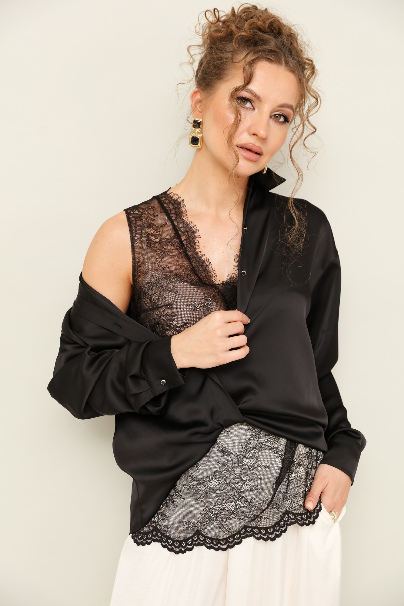 Топ прямого силуэта, выполнен из изысканного французского кружева. V-образный вырез горловины обработан кружевной отделкой.