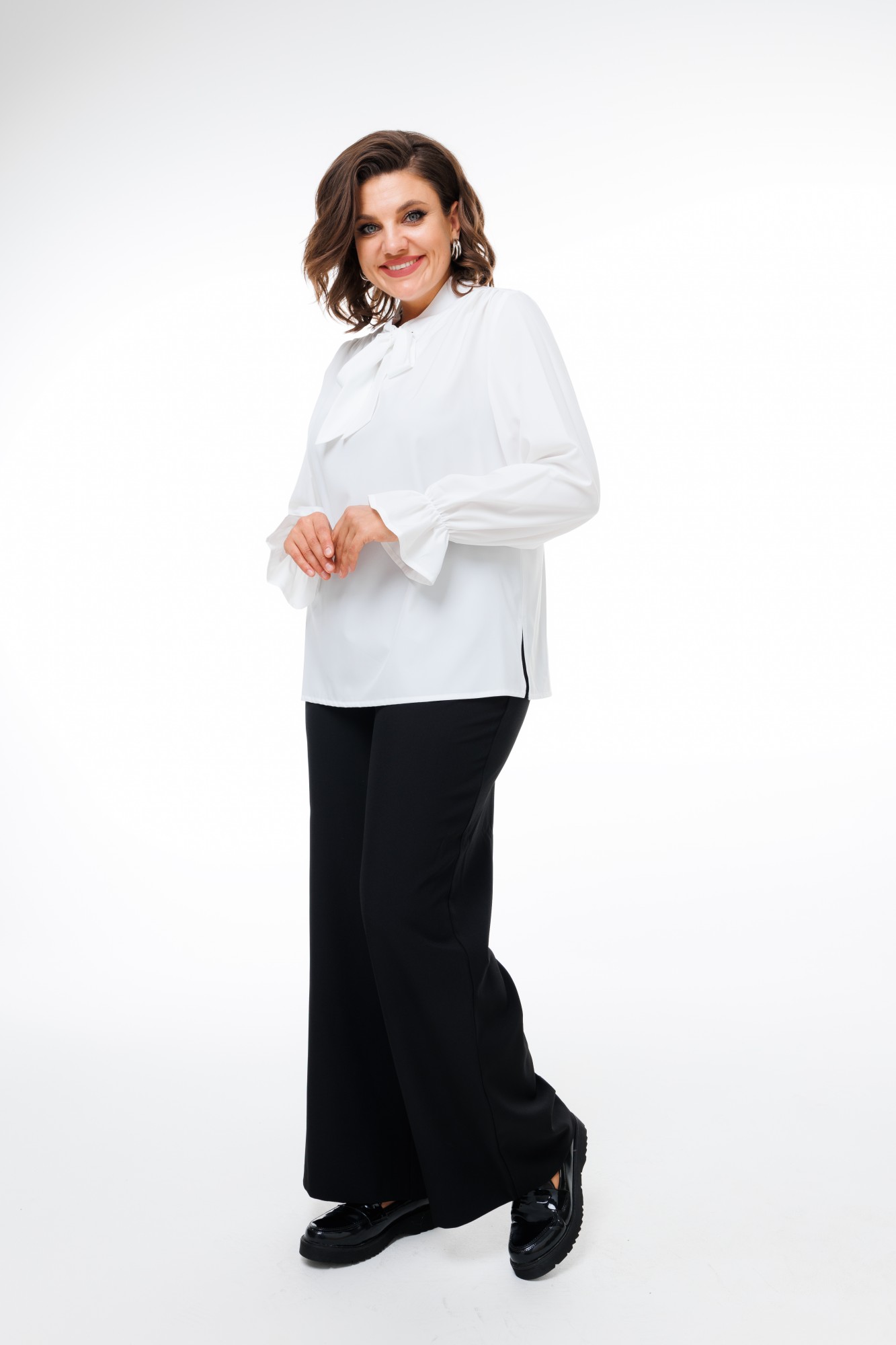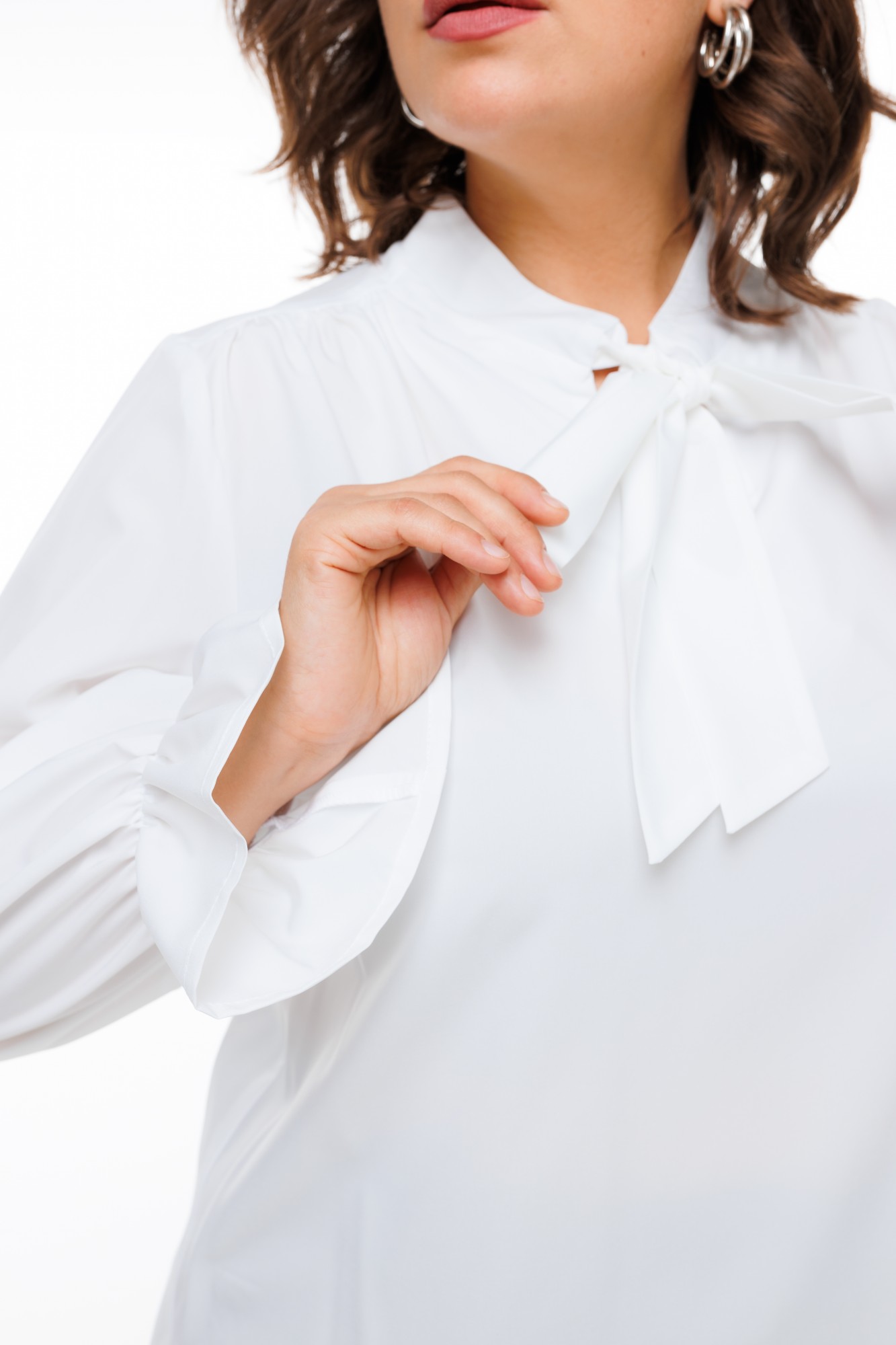 Утонченная деталь – плечевая сборка на передней части, которая создает интересный объемный эффект и подчеркивает вашу индивидуальность. Фигурный вырез обработан обтачкой, что добавляет нотку декоративности и элегантности. Горловина с притачным бантом придает нежность и романтичность, даря образу неповторимый шарм.