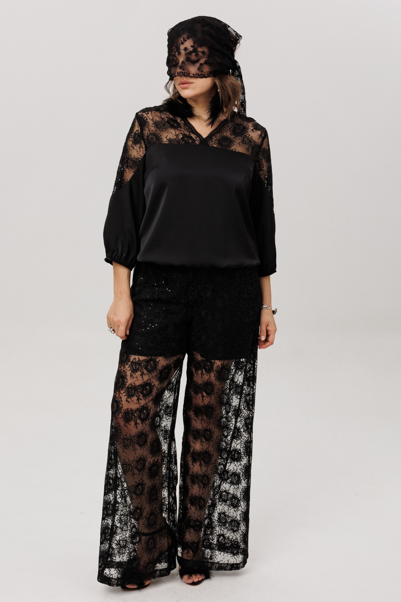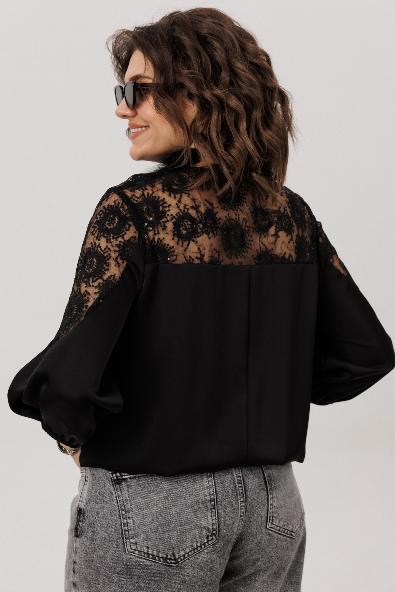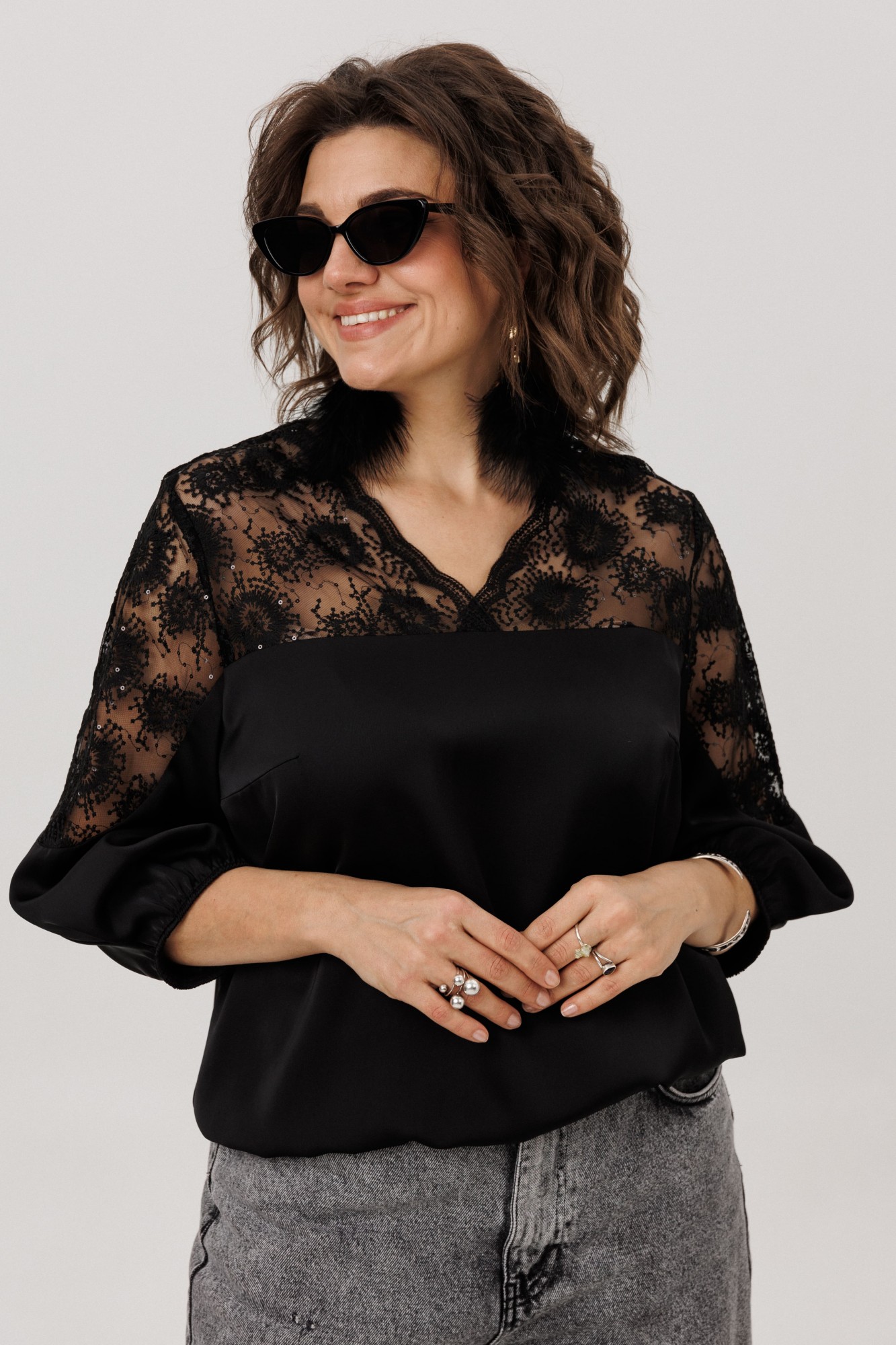 Верхняя часть, словно лёгкое кружевное облако с изысканными кокетками на полочке, спинке и изящными вставками на рукавах, переходит в благородный гладкий атлас, мерцающий приглушённым блеском. Рукава три четверти, собранные у низа на тонкую резинку, и такой же аккуратный низ самой блузы создают мягкие, едва уловимые волны, добавляя образу воздушности и динамики.